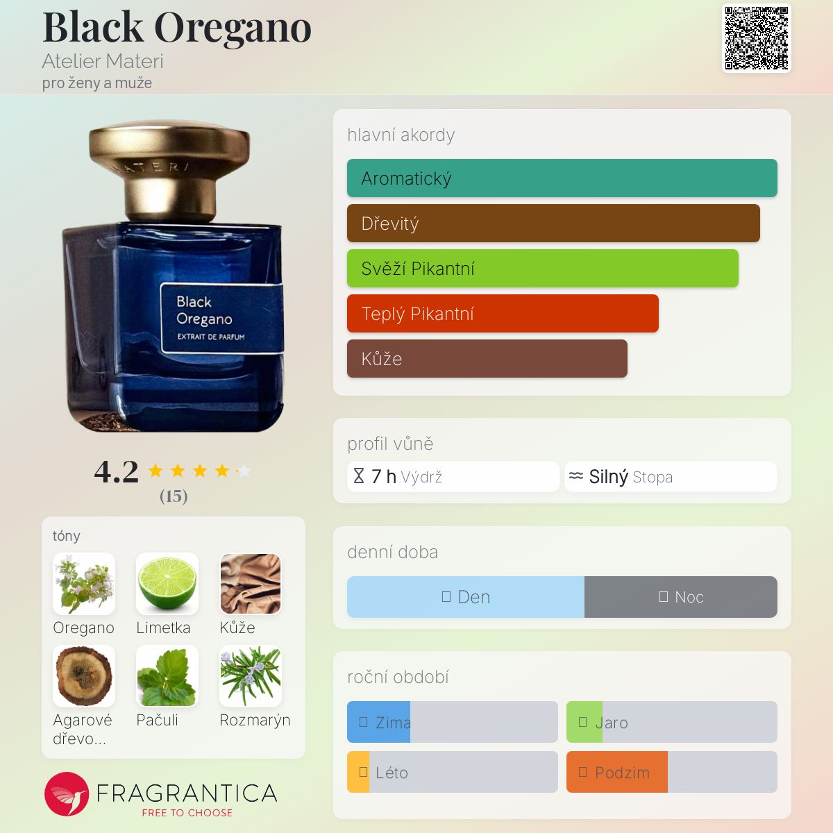 Black Oregano podle Atelier Materi je Orientální Woody vůně pro ženy a muže. Toto je nová vůně. Black Oregano byl/a uveden/a v roce 2025. "Nosem" za touto vůní je Celine Perdriel. Vrchní tóny jsou Limetka, Rozmarýn a Kardamom; střední tóny jsouOregano, Australské santalové dřevo a Vetiver ; základní tóny jsou Kůže, Agarové dřevo (oud), Pačuli a Labdanum.