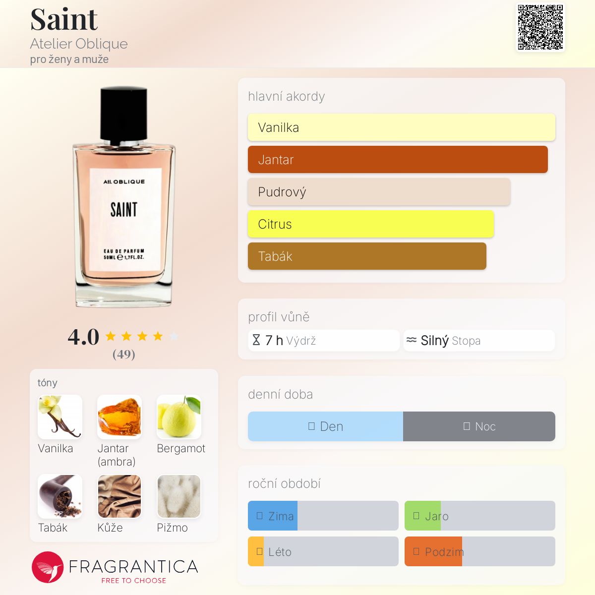 Saint podle Atelier Oblique je Woody vůně pro ženy a muže. Saint byl/a uveden/a v roce 2017. "Nosem" za touto vůní je Sidonie Lancesseur. Vrchní tón je Bergamot ; střední tóny jsouJantar (ambra), Kůže a Cedr ; základní tóny jsou Vanilka, Tabák a Pižmo.
