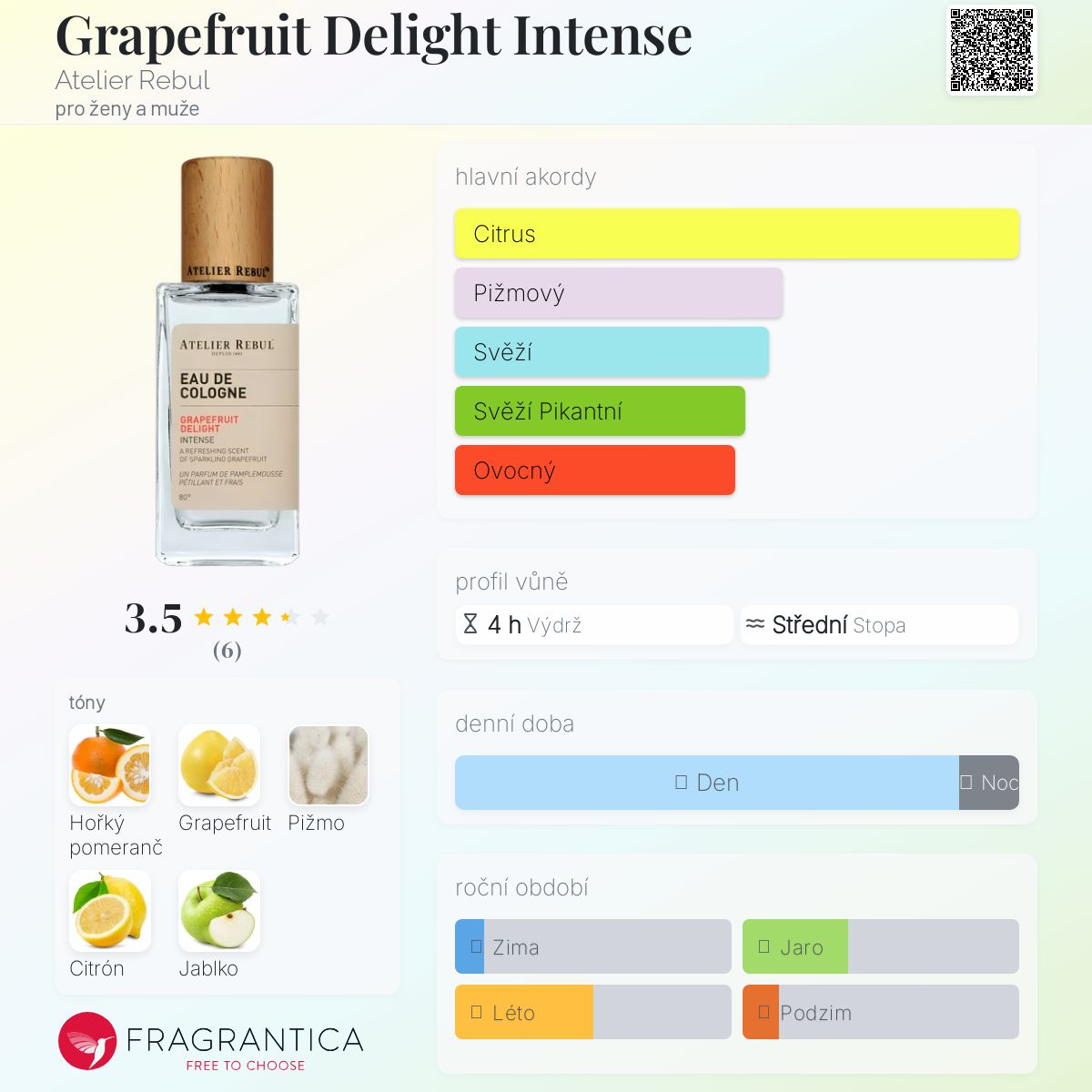 Grapefruit Delight Intense podle Atelier Rebul je Citrus vůně pro ženy a muže. Vrchní tóny jsou Hořký pomeranč a Grapefruit; střední tóny jsouCitrón a Jablko ; základní tón je Pižmo.