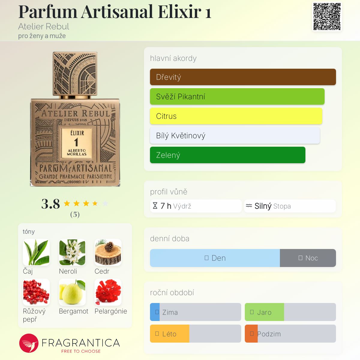 Parfum Artisanal Elixir 1 podle Atelier Rebul je Orientální Floral vůně pro ženy a muže. Parfum Artisanal Elixir 1 byl/a uveden/a v roce 2025. "Nosem" za touto vůní je Alberto Morillas. Vrchní tóny jsou Bílý čaj, Neroli, Růžový pepř a Bergamot; střední tóny jsouPelargónie, Jasmín, Růže a Kosatec ; základní tóny jsou Cedr a Jantar (ambra).