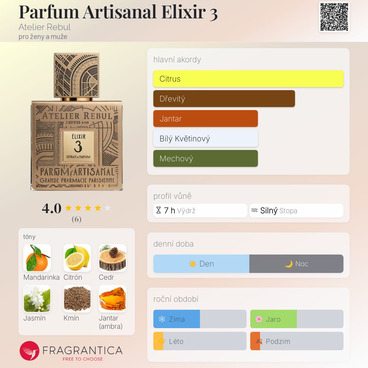 Parfum Artisanal Elixir 3 podle Atelier Rebul je Woody Aromatic vůně pro ženy a muže. Parfum Artisanal Elixir 3 byl/a uveden/a v roce 2025. Vrchní tóny jsou Mandarinka a Citrón; střední tóny jsouJasmín, Kmín a Lilie ; základní tóny jsou Cedr, Jantar (ambra) a Mech.
