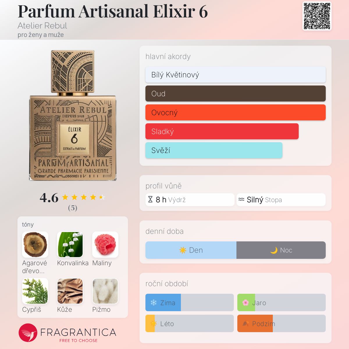 Parfum Artisanal Elixir 6 podle Atelier Rebul je Orientální Woody vůně pro ženy a muže. Parfum Artisanal Elixir 6 byl/a uveden/a v roce 2025. Vrchní tóny jsou Agarové dřevo (oud) a Cypřiš; střední tóny jsouKonvalinka a Maliny ; základní tóny jsou Kůže a Pižmo.