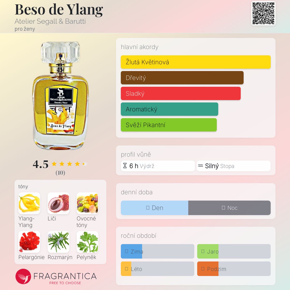 Beso de Ylang podle Atelier Segall & Barutti je Floral vůně pro ženy. Beso de Ylang byl/a uveden/a v roce 2018. "Nosem" za touto vůní je Tzivia Segall. Vrchní tóny jsou Liči, Ovocné tóny, Pelargónie, Rozmarýn, Pelyněk a Pomeranč; střední tóny jsouYlang-Ylang, Růže, Santalové dřevo, Konvalinka, Magnólie a Lilie ; základní tóny jsou Vanilka, Dubový mech, Cibetka a Káva.