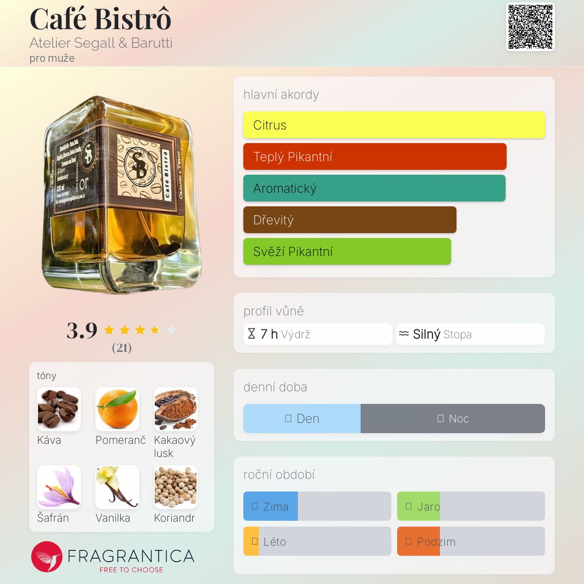 Café Bistrô podle Atelier Segall & Barutti je Aromatic Spicy vůně pro muže. Café Bistrô byl/a uveden/a v roce 2021. "Nosem" za touto vůní je Tzivia Segall. Vrchní tóny jsou Káva, Pomeranč, Koriandr, Toscanol, Anýz, Bergamot, Mandarinka, Estragon, Limetka, Šalvěj, Sicilský citron, Yuzu a Máta; střední tóny jsouPomeranč, Kakao, Šafrán, Bourbonská vanilka, Koriandr, Cejlonská skořice, Muškátový oříšek, Bourbonské geránium a Konvalinka ; základní tóny jsou Káva, Oříškové tóny, Tahitský vetiver, Cedr, Pačuli, Mech, Pižmo, Tabák a Kašmír.