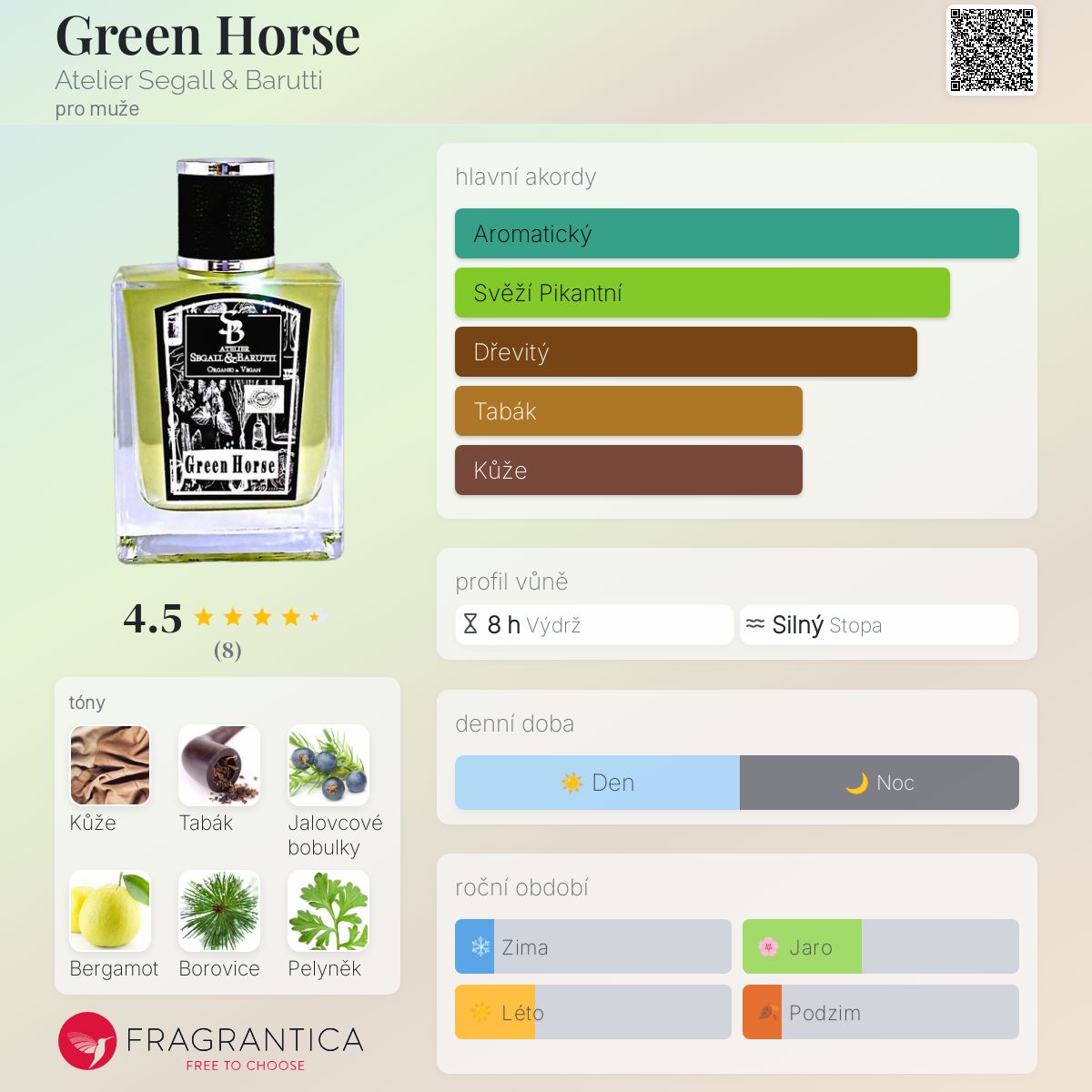 Green Horse podle Atelier Segall & Barutti je Orientální Spicy vůně pro muže. Green Horse byl/a uveden/a v roce 2015. "Nosem" za touto vůní je Tzivia Segall. Vrchní tóny jsou Jalovcové bobulky, Bergamot, Pelyněk, Kmín, Koriandr a Bazalka; střední tóny jsouKůže, Borovice, Hřebíček, Skořice, Pepř, Jasmín, Růže a Pelargónie ; základní tóny jsou Tabák, Jantar (ambra), Vetiver, Pačuli, Dubový mech, Pižmo a Cedr.