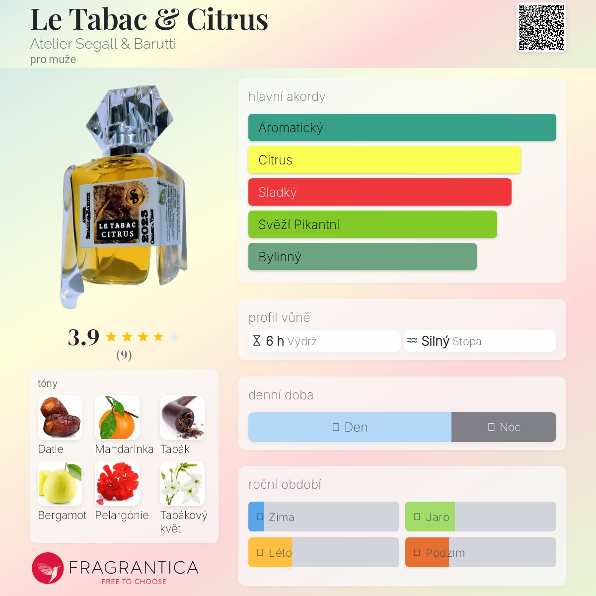 Le Tabac & Citrus podle Atelier Segall & Barutti je Aromatic Fougere vůně pro muže. Le Tabac & Citrus byl/a uveden/a v roce 2016. "Nosem" za touto vůní je Tzivia Segall. Vrchní tóny jsou Datle, Mandarinka, Bergamot, Tabákový květ, Levandule, Grapefruit a Bylinné tóny; střední tóny jsouPelargónie, Šalvěj, Hřebíček, Zelený nard, Tymián, Pelyněk a Koriandr ; základní tóny jsou Tabák, Egyptský balzám, Dubový mech a Arganový strom.