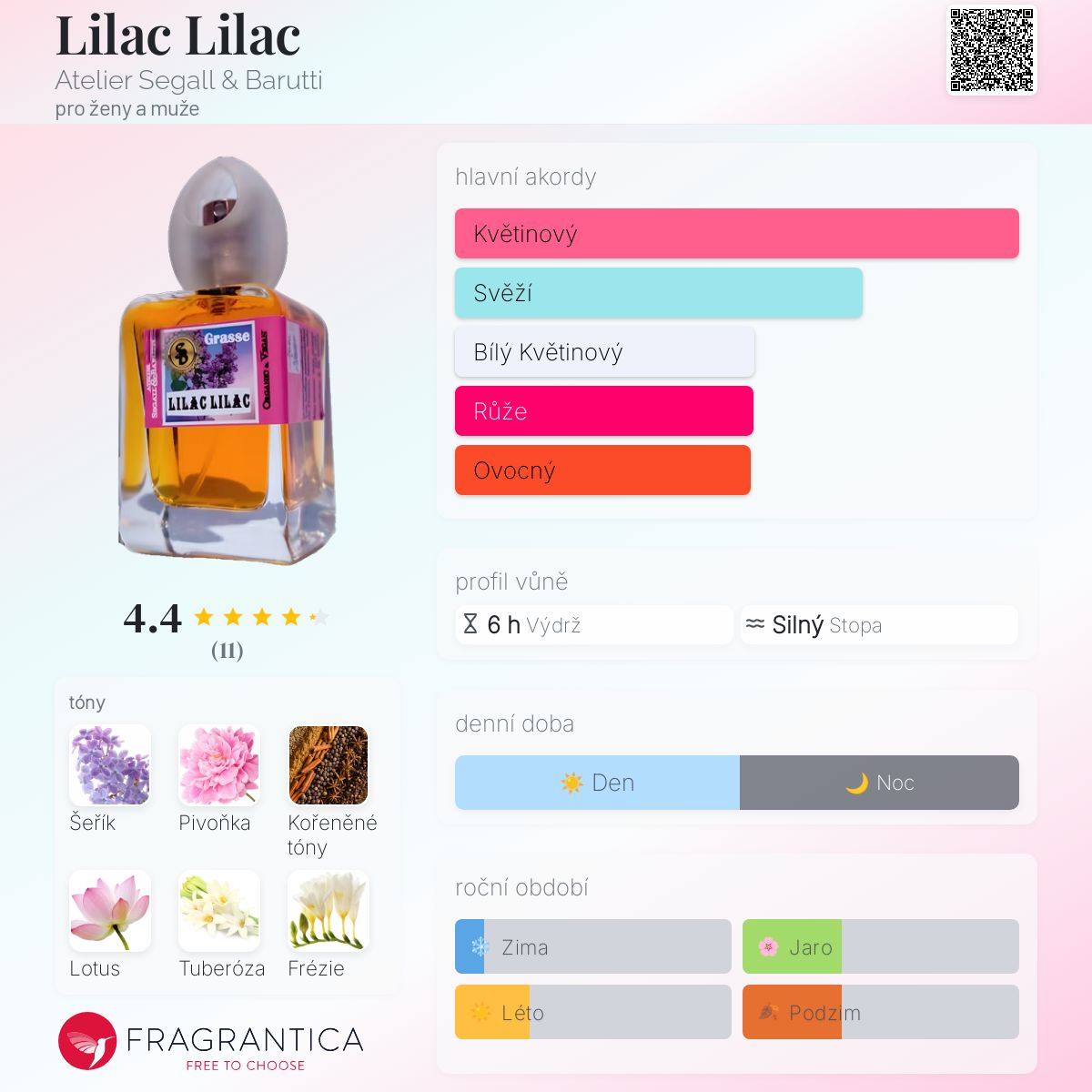 Lilac Lilac podle Atelier Segall & Barutti je Floral Aquatic vůně pro ženy a muže. Lilac Lilac byl/a uveden/a v roce 2016. Vrchní tóny jsou Šeřík, Lotus, Frézie, Meloun, Růžová voda, Lesní jahoda a Calone; střední tóny jsouVodní pivoňka, Koření a Konvalinka ; základní tóny jsou Tuberóza, Vonokvětka, Santalové dřevo, Cedr a Jantar (ambra).