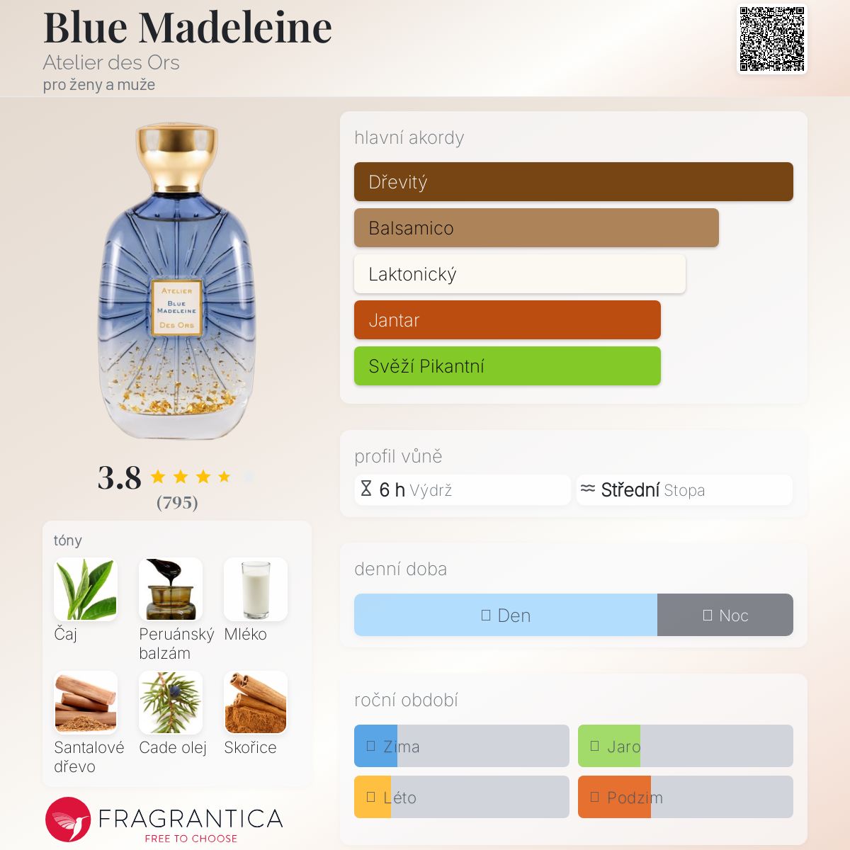 Blue Madeleine podle Atelier des Ors je vůně pro ženy a muže. Toto je nová vůně. Blue Madeleine byl/a uveden/a v roce 2024. "Nosem" za touto vůní je Marie Salamagne. Vrchní tóny jsou Skořice, Růžový pepř a Bergamot; střední tóny jsouČerný čaj, Mléko a Růže ; základní tóny jsou Peruánský balzám, Santalové dřevo, Cade olej a Pralinka.