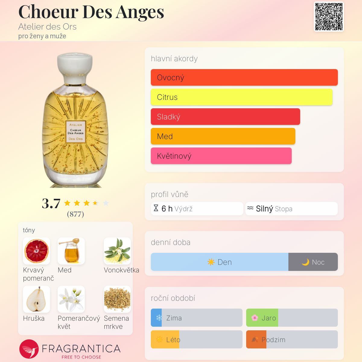 Choeur Des Anges podle Atelier des Ors je Floral vůně pro ženy a muže. Choeur Des Anges byl/a uveden/a v roce 2018. Vrchní tóny jsou Krvavý pomeranč, Hruška a Černý rybíz; střední tóny jsouVonokvětka, Pomerančový květ a Semena mrkve ; základní tóny jsou Med, Jantar (ambra) a Cedr.