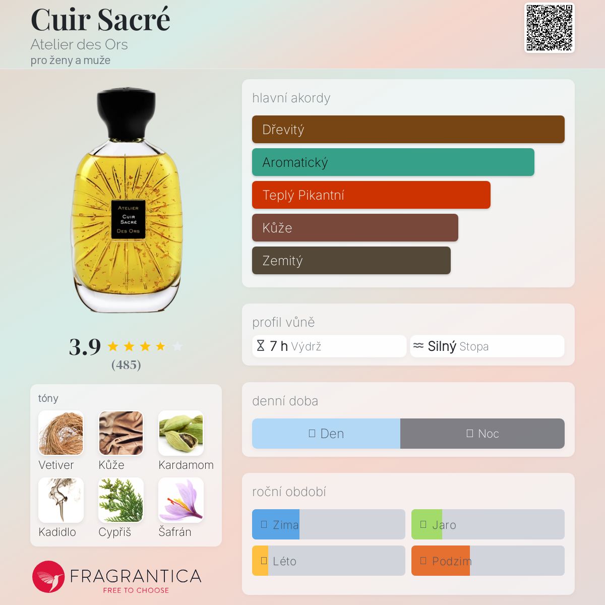 Cuir Sacré podle Atelier des Ors je Leather vůně pro ženy a muže. Cuir Sacré byl/a uveden/a v roce 2015. "Nosem" za touto vůní je Marie Salamagne. Vrchní tóny jsou Kardamom, Cypřiš a Jalovcové bobulky; střední tóny jsouKadidlo, Šafrán a Cedrové jehly ; základní tóny jsou Vetiver, Kůže a Cypriolový olej.