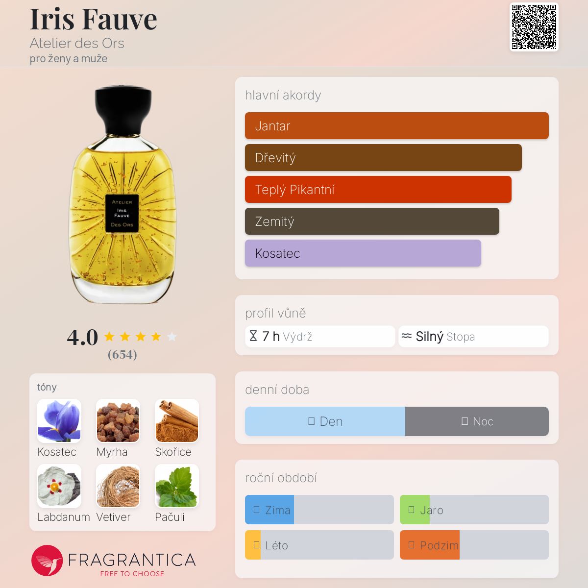 Iris Fauve podle Atelier des Ors je vůně pro ženy a muže. Iris Fauve byl/a uveden/a v roce 2017. "Nosem" za touto vůní je Marie Salamagne. Vrchní tóny jsou Kosatec, Skořice a Bergamot; střední tóny jsouHaitský vetiver, Pačuli a Cypriolový olej ; základní tóny jsou Myrha, Labdanum, Pižmo a Šuškarda.