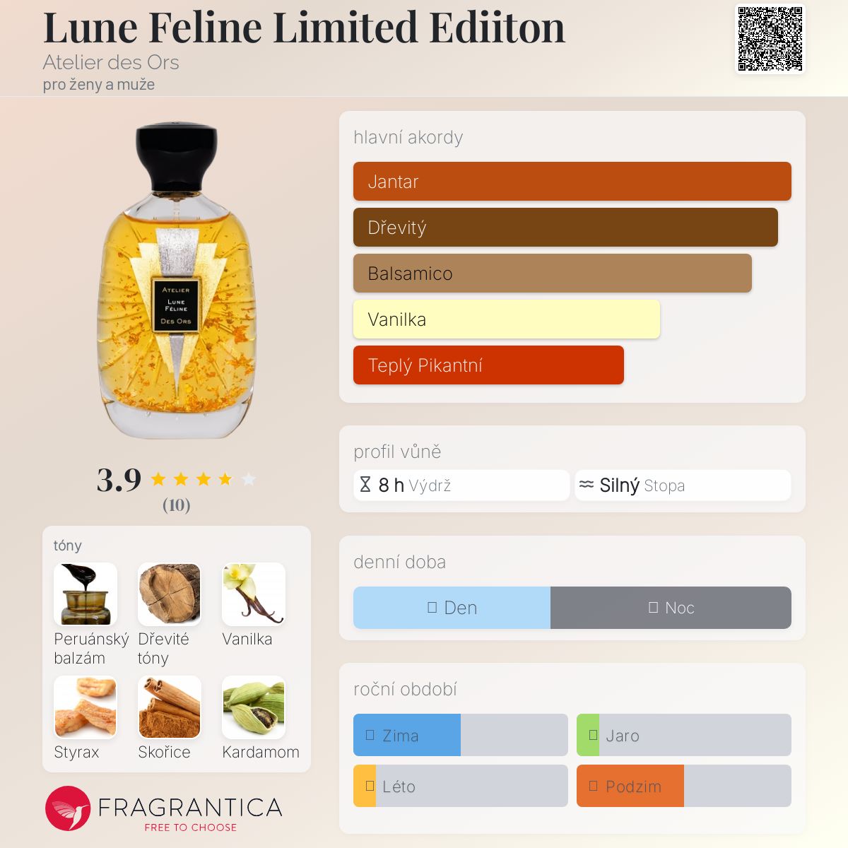 Lune Feline Limited Ediiton podle Atelier des Ors je Orientální Vanilla vůně pro ženy a muže. Lune Feline Limited Ediiton byl/a uveden/a v roce 2023. "Nosem" za touto vůní je Marie Salamagne. Vrchní tóny jsou Skořice, Kardamom a Růžový pepř; střední tóny jsouDřevité tóny, Styrax, Ambra, Cedr a Zelené tóny ; základní tóny jsou Peruánský balzám, Tahitská vanilka a Pižmo.