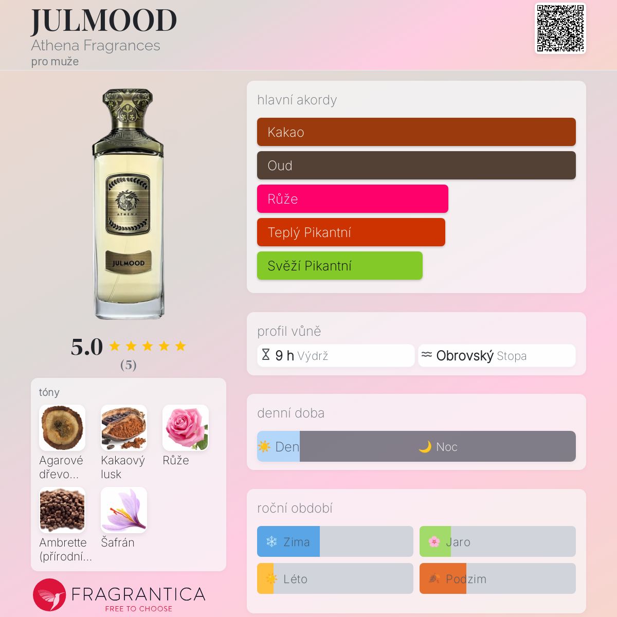 JULMOOD podle Athena Fragrances je Orientální Woody vůně pro muže. Toto je nová vůně. JULMOOD byl/a uveden/a v roce 2025. Vrchní tón je Šafrán ; střední tóny jsouAgarové dřevo (oud) a Bulharská růže ; základní tóny jsou Kakao, Ambrette (přírodní pižmo) a Agarové dřevo (oud).