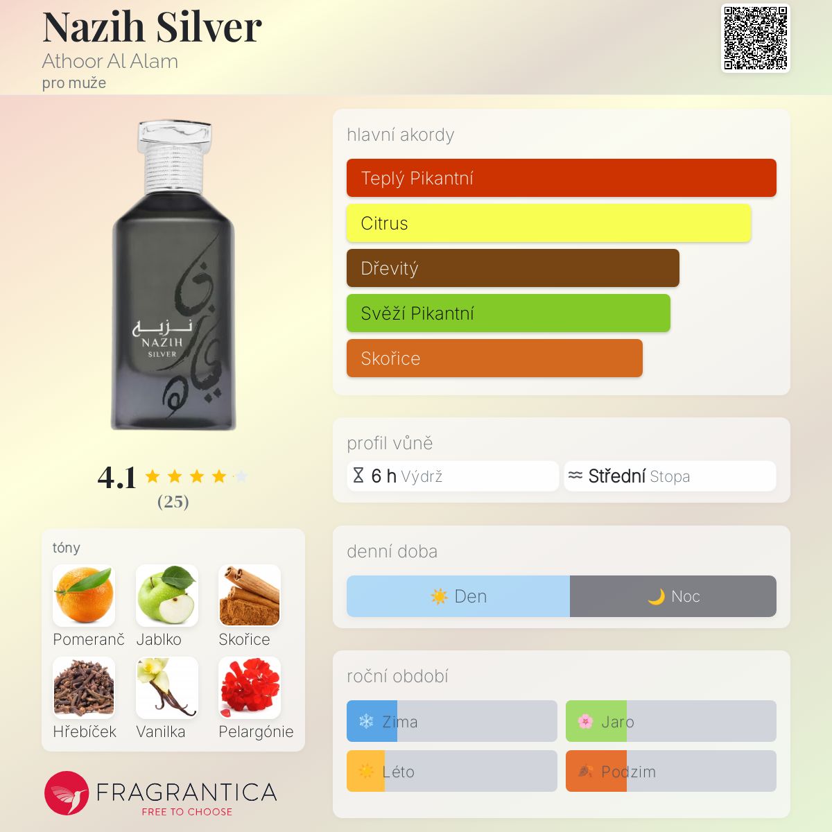 Nazih Silver podle Athoor Al Alam je Woody vůně pro muže. Vrchní tóny jsou Pomeranč, Jablko, Bergamot a Citrón; střední tóny jsouSkořice, Hřebíček a Pelargónie ; základní tóny jsou Vanilka, Santalové dřevo a Cedr.