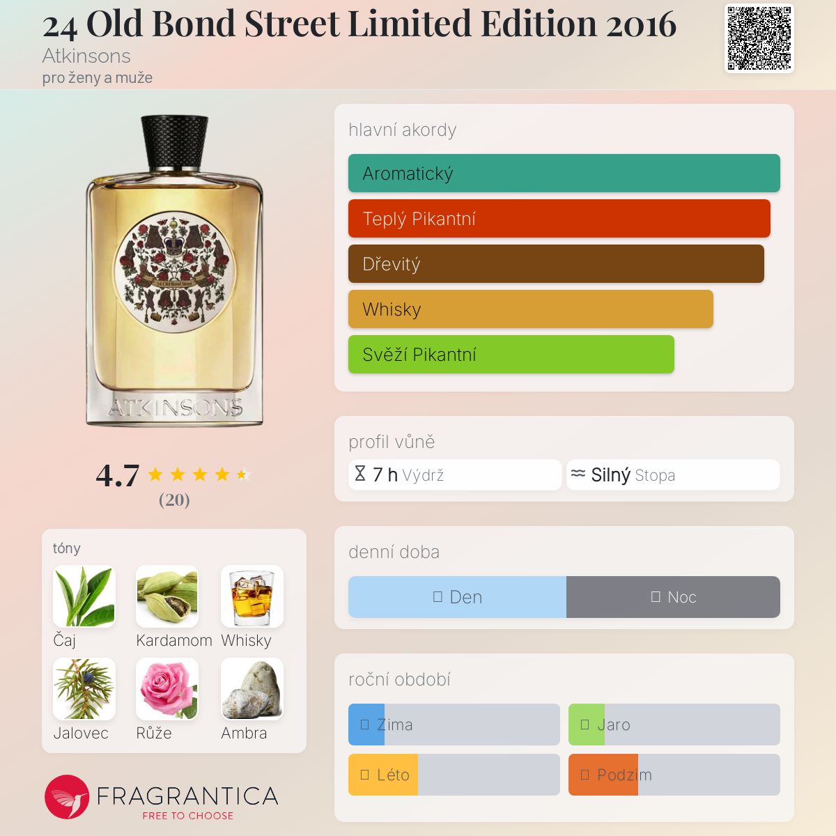 24 Old Bond Street Limited Edition 2016 podle Atkinsons je Woody Aromatic vůně pro ženy a muže. 24 Old Bond Street Limited Edition 2016 byl/a uveden/a v roce 2016. 24 Old Bond Street Limited Edition 2016 byl/a vytvořen/a Violaine Collas a Christine Nagel. Vrchní tóny jsou Kardamom a Jalovec; střední tóny jsouWhisky a Růže ; základní tóny jsou Černý čaj, Ambra, Pižmo a Cedr.