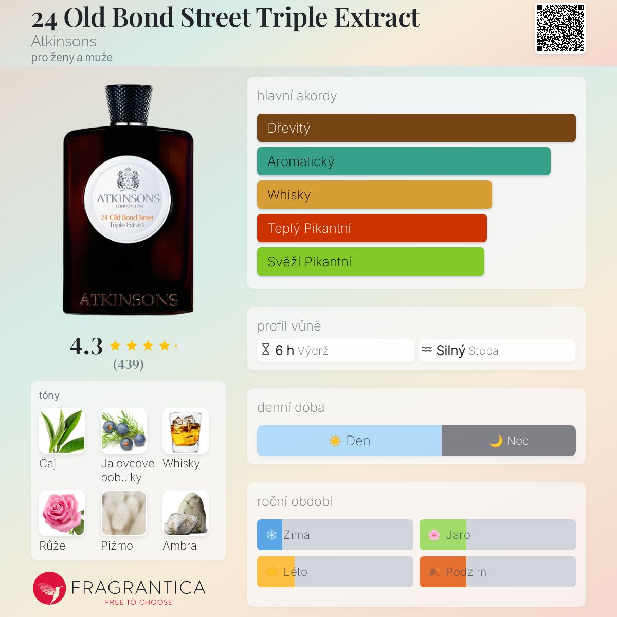 24 Old Bond Street Triple Extract podle Atkinsons je Woody Aromatic vůně pro ženy a muže. 24 Old Bond Street Triple Extract byl/a uveden/a v roce 2014. 24 Old Bond Street Triple Extract byl/a vytvořen/a Christine Nagel a Violaine Collas. Vrchní tóny jsou Jalovcové bobulky a Kardamom; střední tóny jsouWhisky a Růže ; základní tóny jsou Černý čaj, Pižmo, Ambra a Cedr.