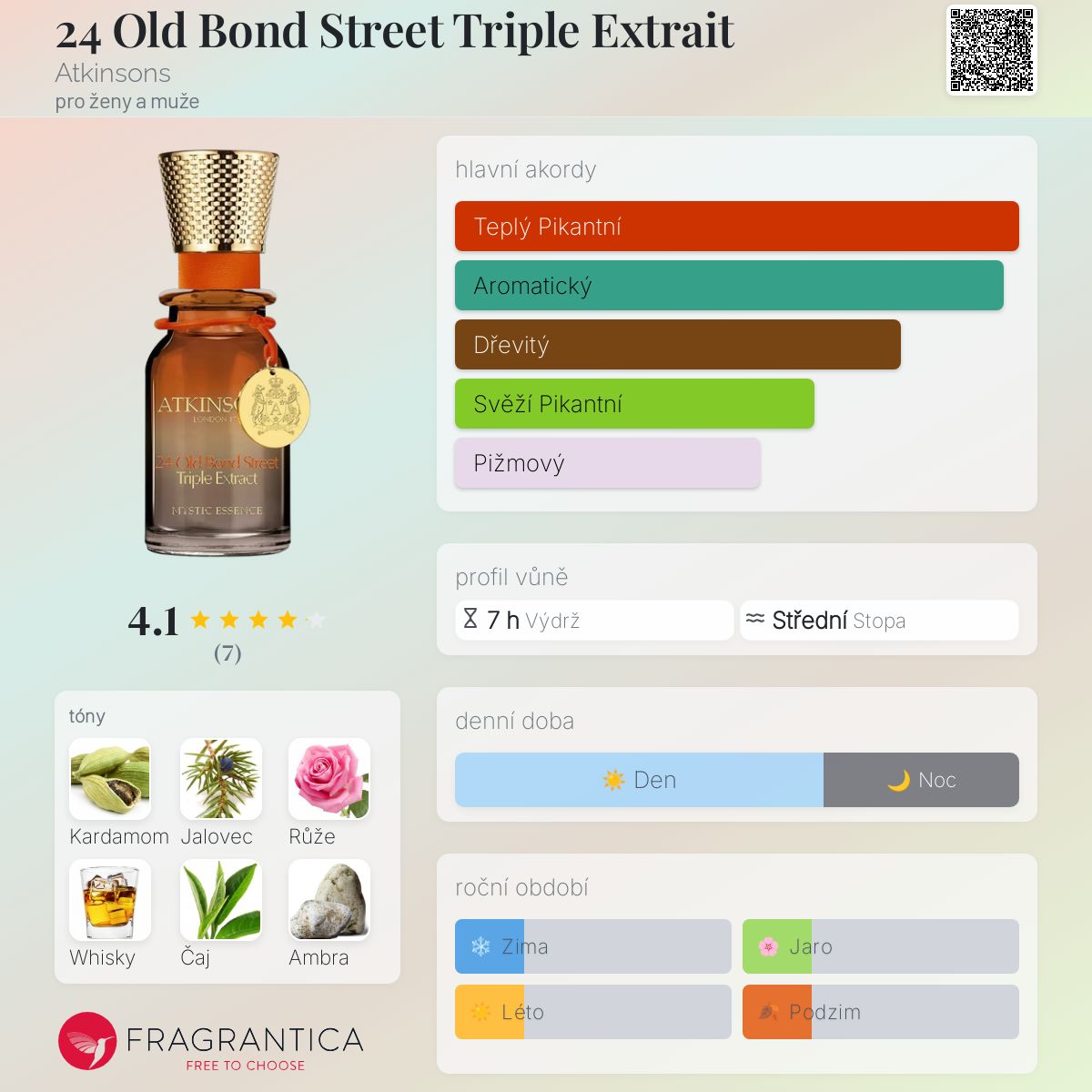 24 Old Bond Street Triple Extrait podle Atkinsons je Woody Aromatic vůně pro ženy a muže. 24 Old Bond Street Triple Extrait byl/a uveden/a v roce 2019. 24 Old Bond Street Triple Extrait byl/a vytvořen/a Violaine Collas a Christine Nagel. Vrchní tóny jsou Kardamom a Jalovec; střední tóny jsouRůže a Whisky ; základní tóny jsou Černý čaj, Ambra, Pižmo a Cedr.