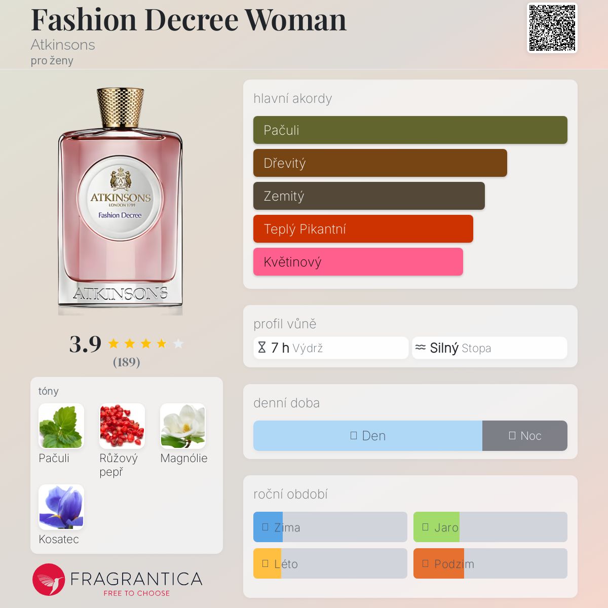Fashion Decree Woman podle Atkinsons je Chypre vůně pro ženy. Fashion Decree Woman byl/a uveden/a v roce 2013. Vrchní tón je Růžový pepř ; střední tóny jsouMagnólie a Kosatec ; základní tón je List pačuli.