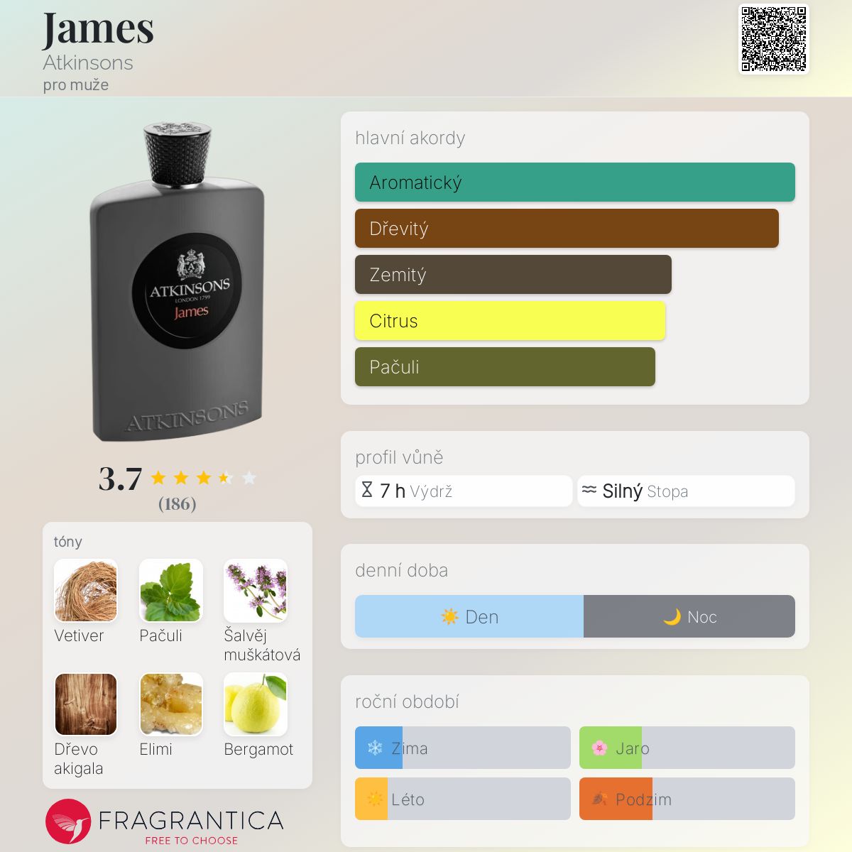 James podle Atkinsons je Aromatic Green vůně pro muže. James byl/a uveden/a v roce 2022. Vrchní tóny jsou Šalvěj muškátová, Bergamot, Kaviárový citrus a Růžový pepř; střední tóny jsouPryskyřice elimi, Fialkový list a Bílé květy ; základní tóny jsou Vetiver, Pačuli, Dřevo akigala a Pižmo.