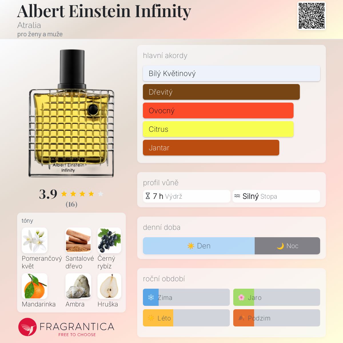 Albert Einstein Infinity podle Atralia je Floral Fruity vůně pro ženy a muže. Toto je nová vůně. Albert Einstein Infinity byl/a uveden/a v roce 2024. Vrchní tóny jsou Černý rybíz, Mandarinka a Hruška; střední tóny jsouPomerančový květ, Jasmín a Kokosová voda ; základní tóny jsou Santalové dřevo, Ambra, Pižmo a Peruánský balzám.