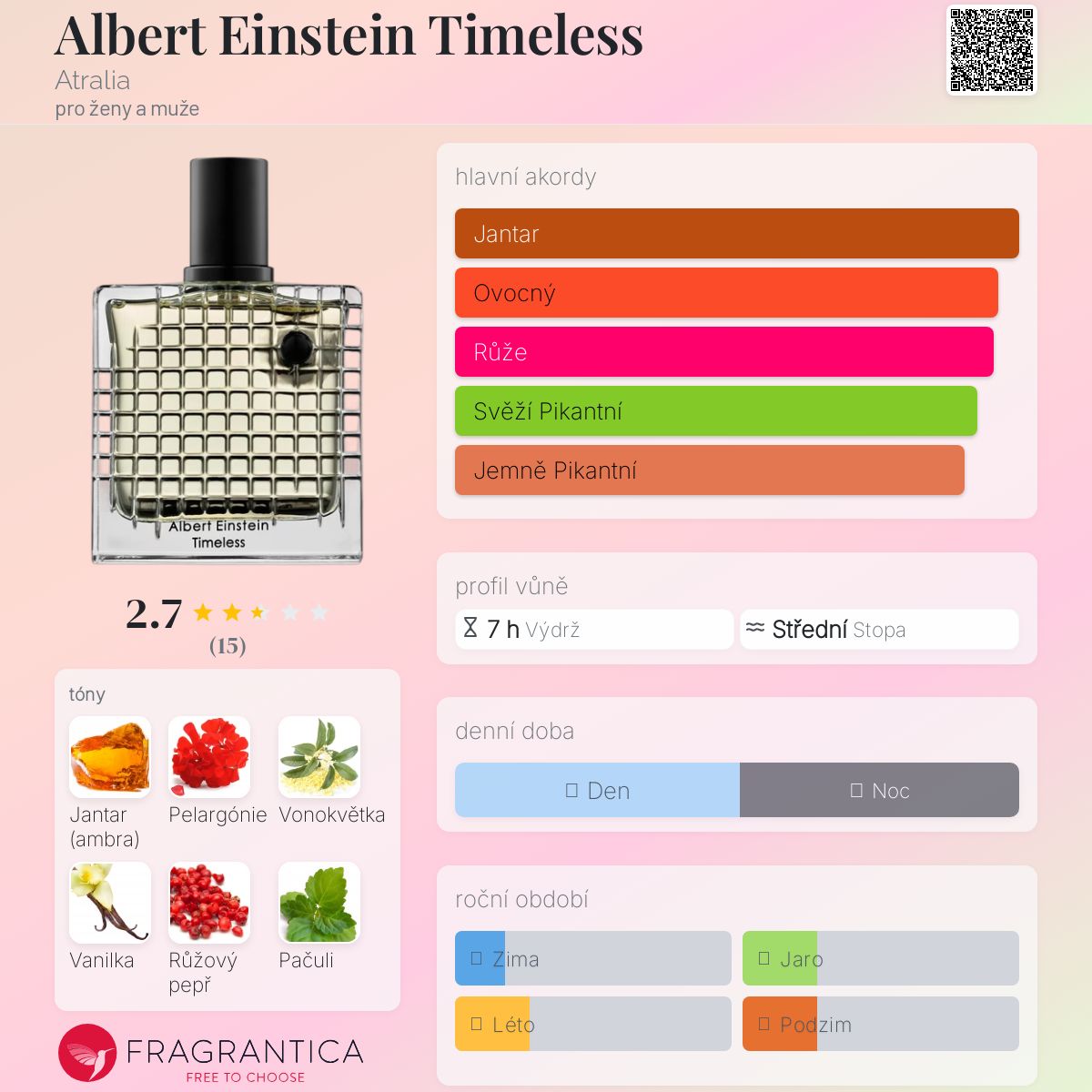 Albert Einstein Timeless podle Atralia je Orientální Floral vůně pro ženy a muže. Toto je nová vůně. Albert Einstein Timeless byl/a uveden/a v roce 2024. Vrchní tóny jsou Růžový pepř, Maliny a Liči; střední tóny jsouPelargónie, Vonokvětka a Růže ; základní tóny jsou Jantar (ambra), Vanilka a Pačuli.