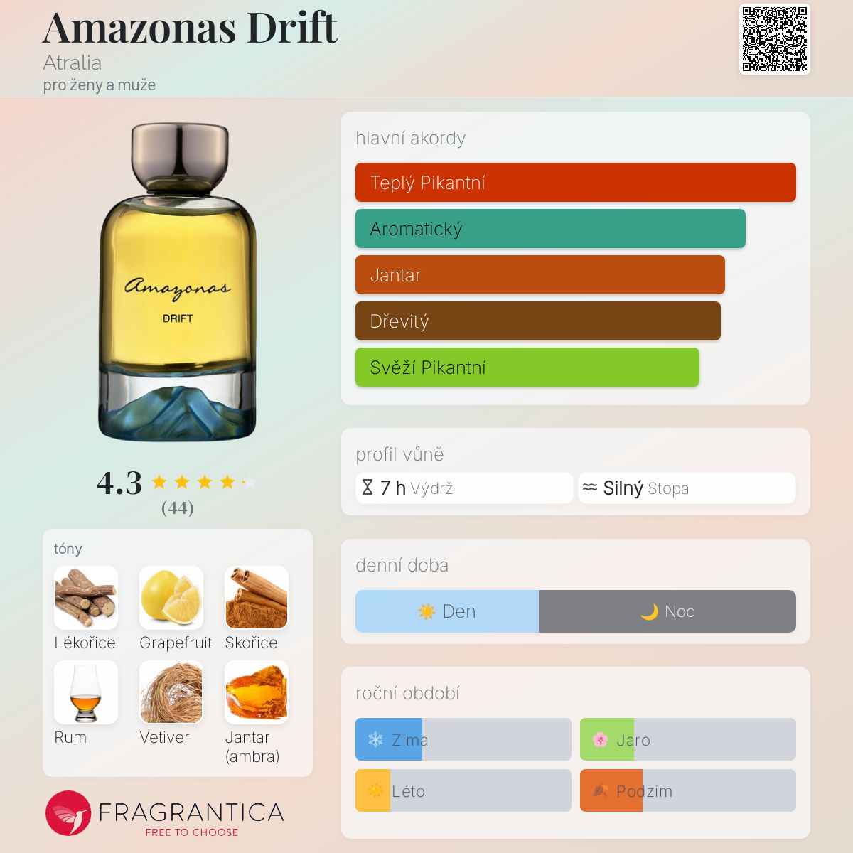 Amazonas Drift podle Atralia je Woody Spicy vůně pro ženy a muže. Toto je nová vůně. Amazonas Drift byl/a uveden/a v roce 2024. Vrchní tóny jsou Grapefruit, Skořice a Muškátový oříšek; střední tóny jsouRum, Levandule a Kardamom ; základní tóny jsou Lékořice, Vetiver, Jantar (ambra), Kadidlo, Pačuli a Santalové dřevo.
