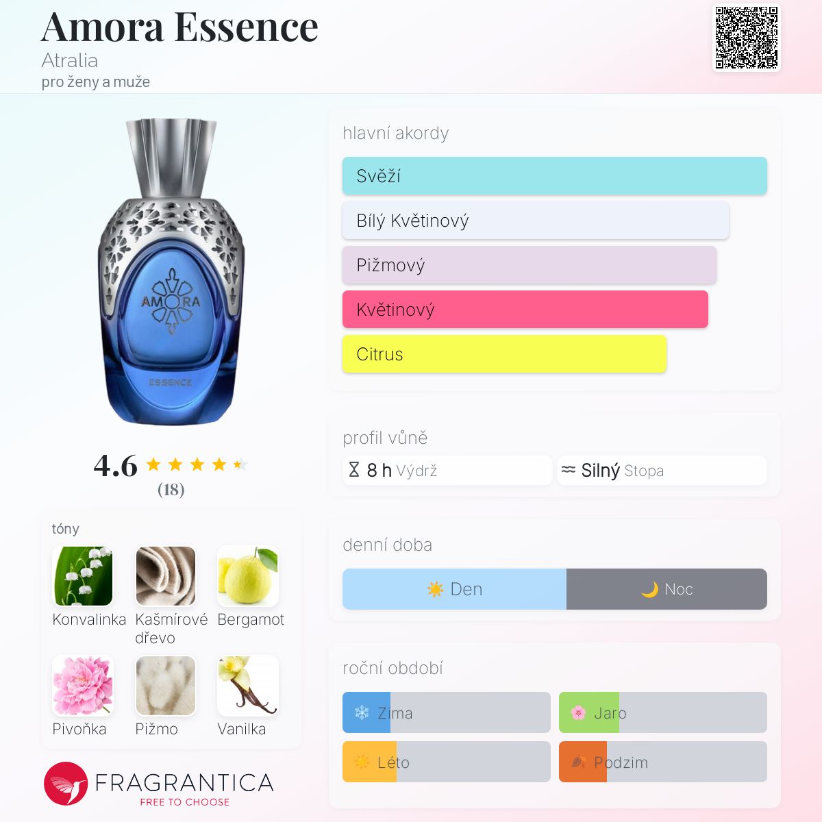Amora Essence podle Atralia je vůně pro ženy a muže. Toto je nová vůně. Amora Essence byl/a uveden/a v roce 2024. Vrchní tóny jsou Bergamot, Rebarbora a Liči; střední tóny jsouKonvalinka, Pivoňka a Růže ; základní tóny jsou Kašmírové dřevo, Pižmo a Vanilka.