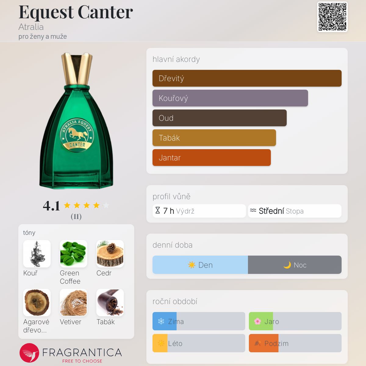 Equest Canter podle Atralia je vůně pro ženy a muže. Toto je nová vůně. Equest Canter byl/a uveden/a v roce 2024. Vrchní tón je Zelená káva ; střední tóny jsouCedr, Vetiver a Tabák ; základní tóny jsou Kouř, Agarové dřevo (oud) a Jantar (ambra).
