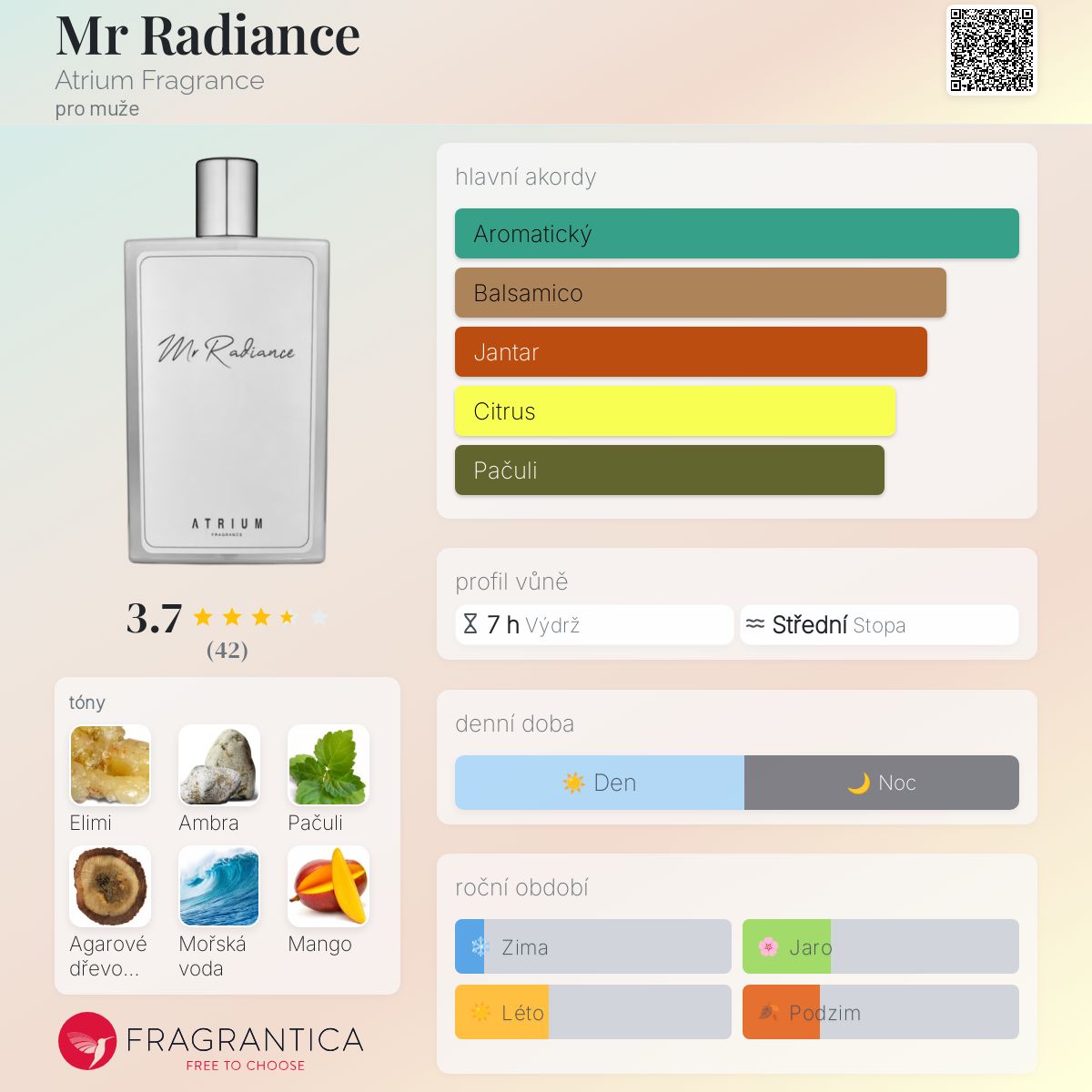 Mr Radiance podle Atrium Fragrance je Woody Aquatic vůně pro muže. Toto je nová vůně. Mr Radiance byl/a uveden/a v roce 2024. "Nosem" za touto vůní je John Stephen. Vrchní tóny jsou Citrón, Limetka a Pomeranč; střední tóny jsouElemi, Mořské tóny a Mango ; základní tóny jsou Ambra, Pačuli a Agarové dřevo (oud).