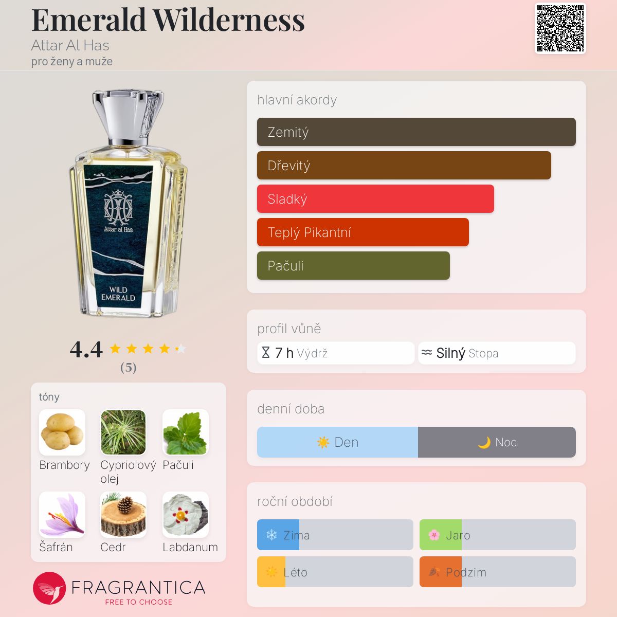Emerald Wilderness podle Attar Al Has je Orientální Spicy vůně pro ženy a muže. Toto je nová vůně. Emerald Wilderness byl/a uveden/a v roce 2024. Vrchní tóny jsou Brambory, Šafrán a Kmín; střední tóny jsouLabdanum, Santalové dřevo a Růže ; základní tóny jsou Cypriolový olej, Pačuli, Cedr, Vanilka, Fazole tonka, Bílé pižmo a Jantar (ambra).