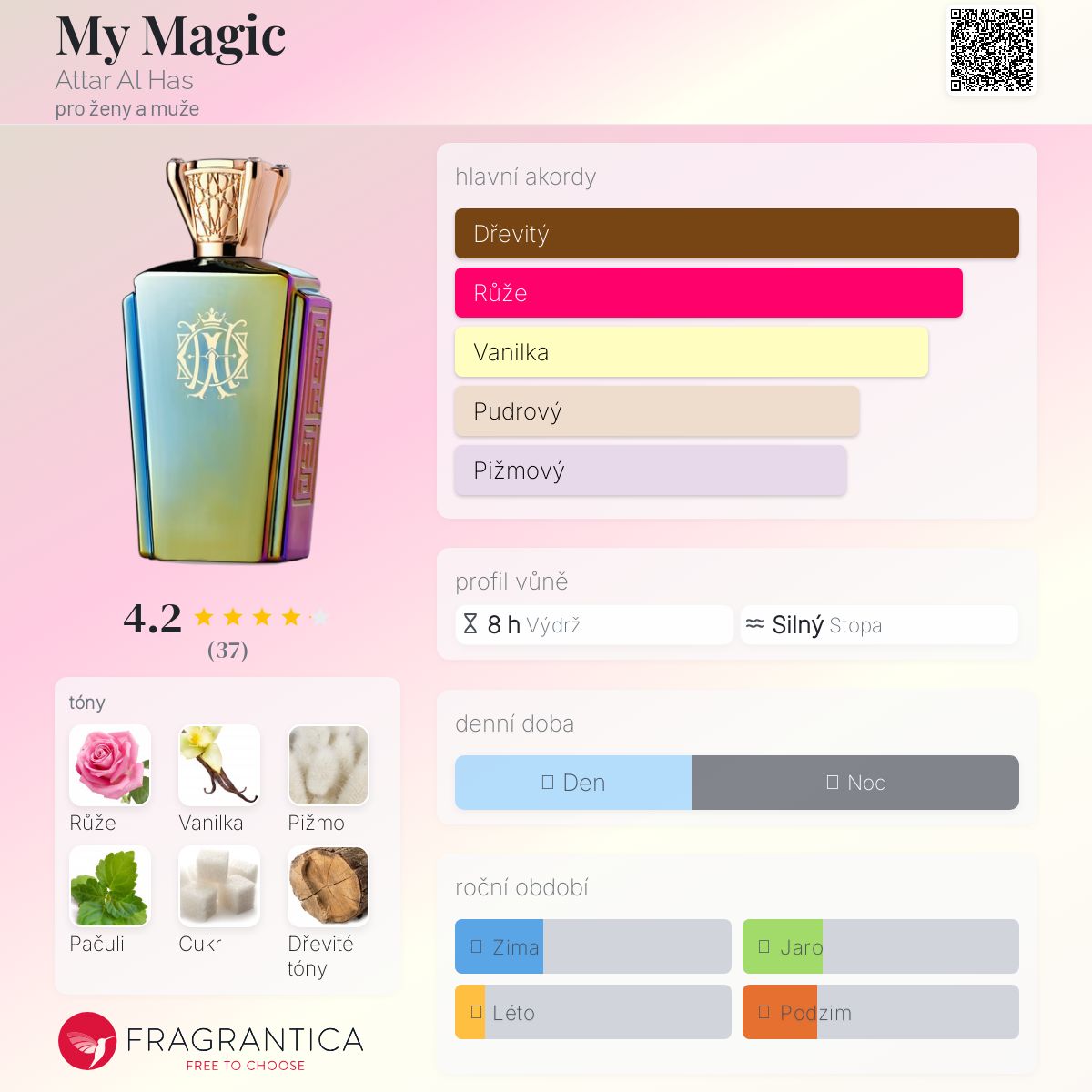 My Magic podle Attar Al Has je Orientální Floral vůně pro ženy a muže. My Magic byl/a uveden/a v roce 2021. "Nosem" za touto vůní je Mohammad Tammam Mando. Vrchní tóny jsou Vanilka, Dřevité tóny, Vonokvětka, Vodní tóny a Citrón; střední tóny jsouRůže, Damašská růže a Cukr ; základní tóny jsou Madagaskarská vanilka, Pižmo, Pačuli, Cypriolový olej, Santalové dřevo, Jantar (ambra) a Benzoin.