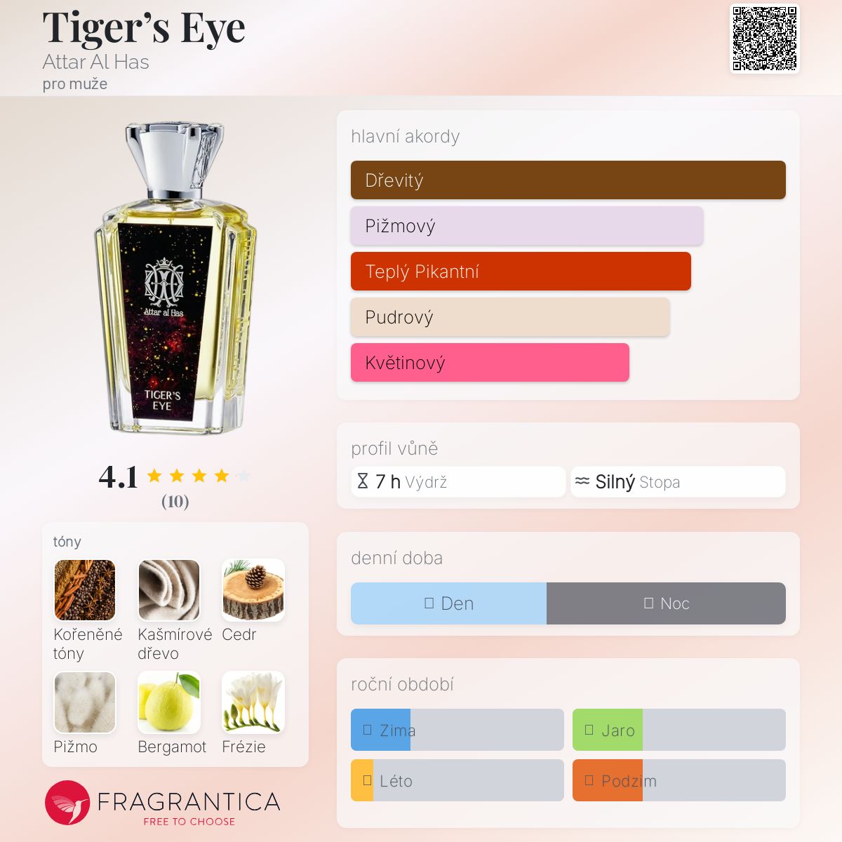 Tiger’s Eye podle Attar Al Has je Floral Woody Musk vůně pro muže. Toto je nová vůně. Tiger’s Eye byl/a uveden/a v roce 2024. Vrchní tóny jsou Koření a Bergamot; střední tóny jsouFrézie, Kosatec a Konvalinka ; základní tóny jsou Kašmírové dřevo, Cedr, Pižmo, Mech, Tabák a Jantar (ambra).