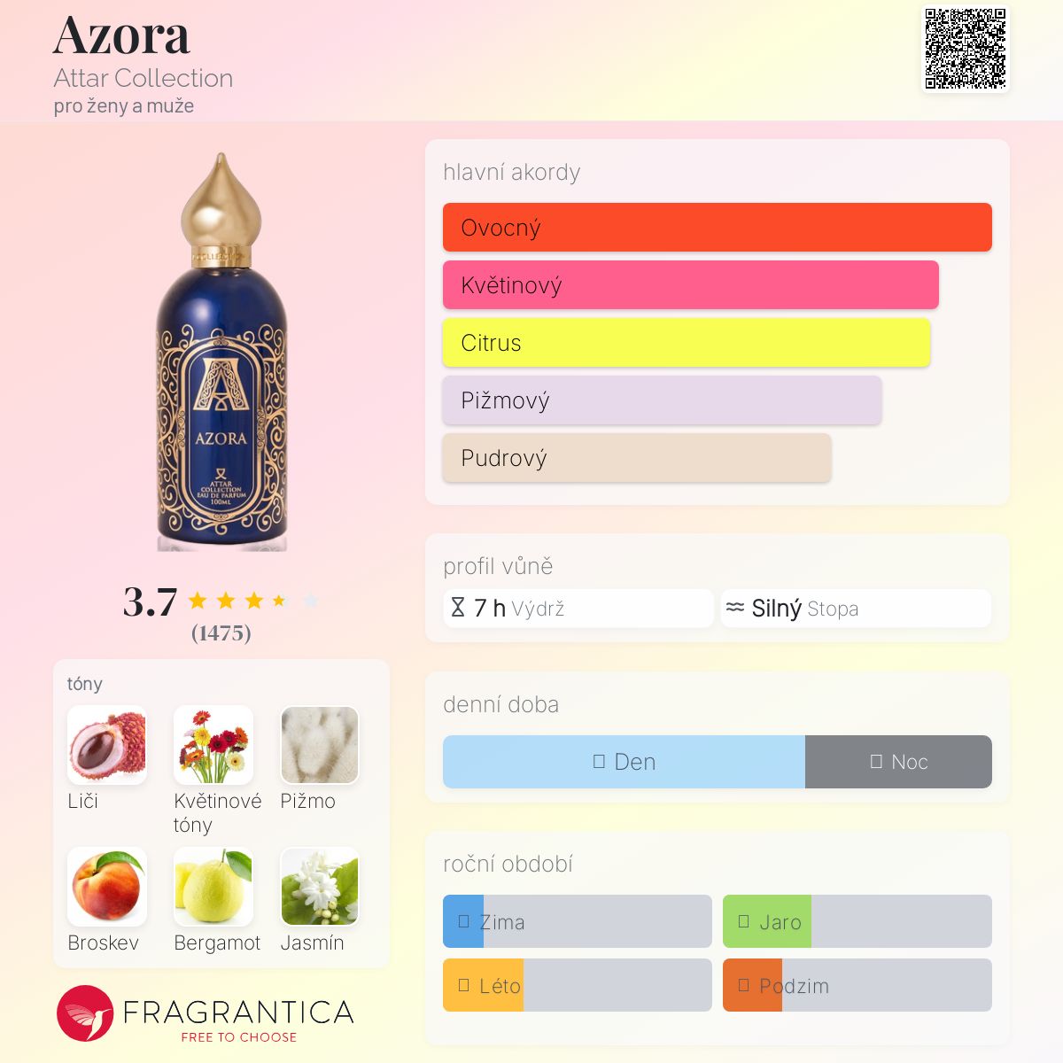 Azora podle Attar Collection je Floral Fruity vůně pro ženy a muže. Azora byl/a uveden/a v roce 2018. "Nosem" za touto vůní je Miroslav Petkov. Vrchní tóny jsou Liči, Bergamot a Pomeranč; střední tóny jsouKvětinové tóny, Broskev a Jasmín ; základní tóny jsou Bílé pižmo a Dřevité tóny.