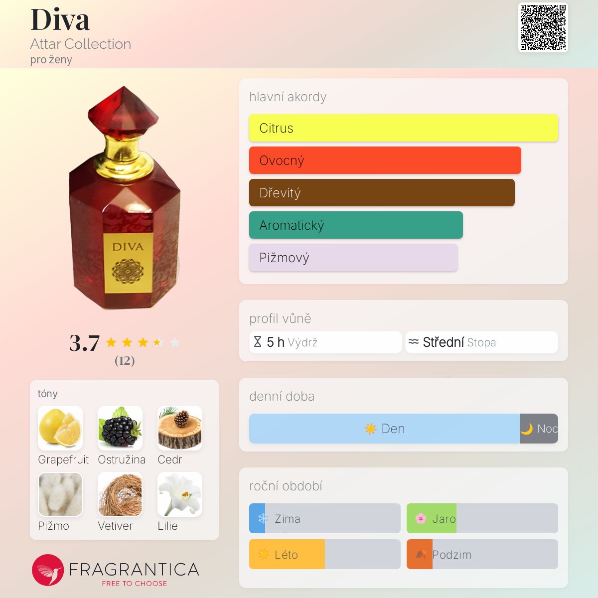 Diva podle Attar Collection je Floral Fruity vůně pro ženy. Diva byl/a uveden/a v roce 2015. Vrchní tóny jsou Vetiver a Lilie; střední tóny jsouOstružina a Cedr ; základní tóny jsou Grapefruit a Bílé pižmo.