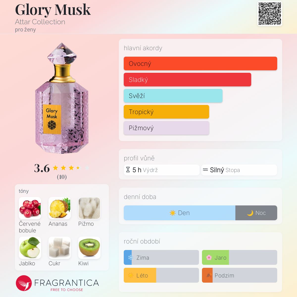 Glory Musk podle Attar Collection je Floral Fruity Gourmand vůně pro ženy. Glory Musk byl/a uveden/a v roce 2015. Glory Musk byl/a vytvořen/a Mustafa Firoz a Esmail Firoz. Vrchní tóny jsou Červené bobule, Zelené jablko a Kiwi; střední tóny jsouAnanas a Pomerančový list ; základní tóny jsou Bílé pižmo a Cukr.
