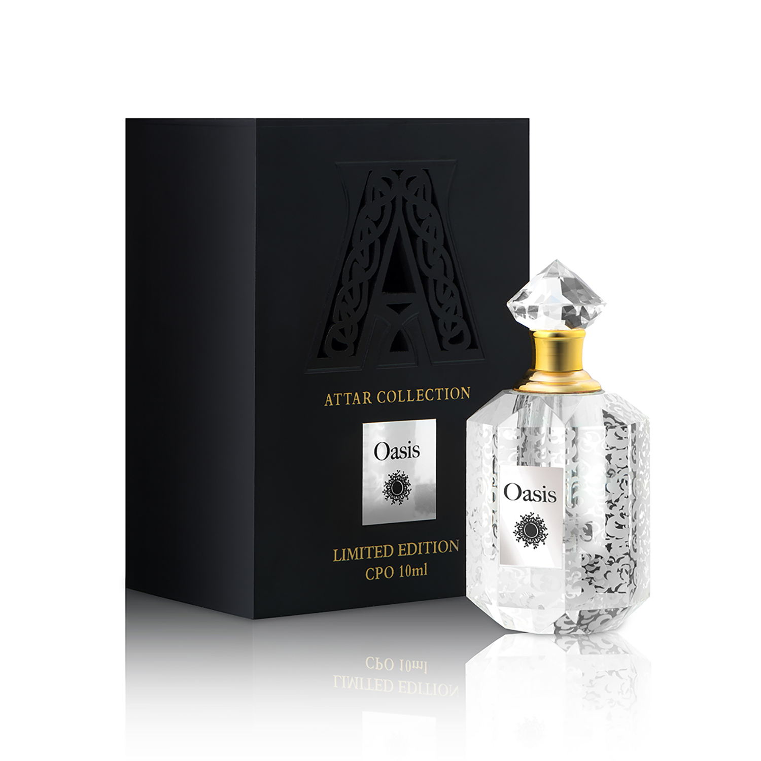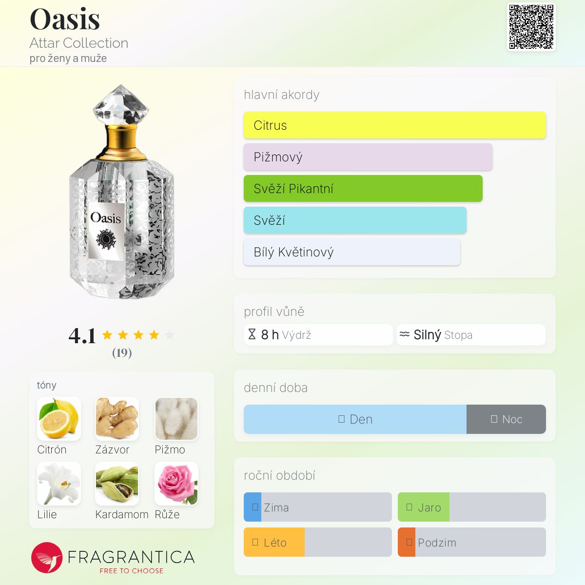 Oasis podle Attar Collection je Citrus vůně pro ženy a muže. Oasis byl/a uveden/a v roce 2015. Oasis byl/a vytvořen/a Mustafa Firoz a Esmail Firoz. Vrchní tóny jsou Citrón, Zázvor a Zelená lilie; střední tóny jsouCitronová kůra, Kardamom a Bílá růže ; základní tóny jsou Pižmo a Agarové dřevo (oud).