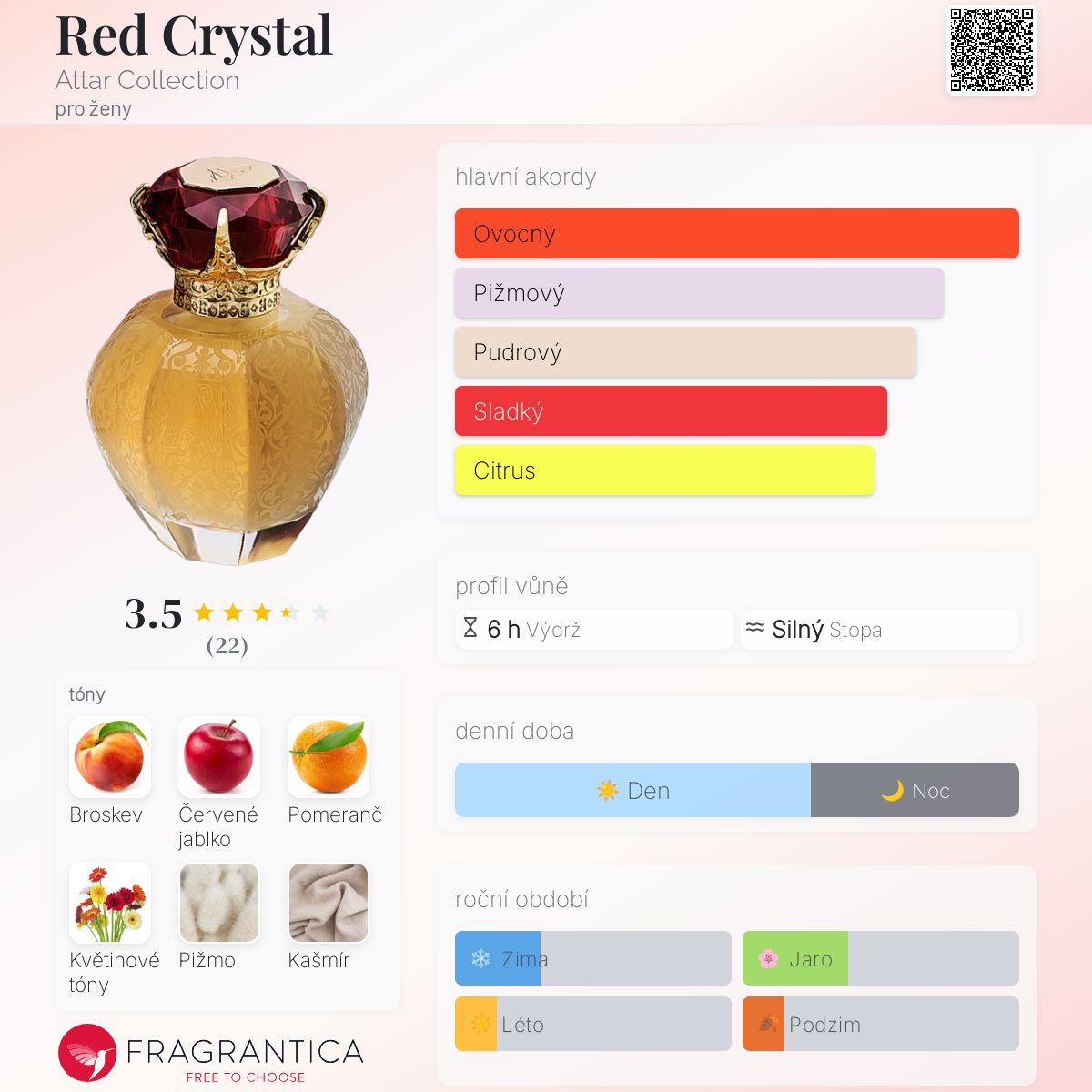 Red Crystal podle Attar Collection je Floral Fruity vůně pro ženy. Red Crystal byl/a uveden/a v roce 2016. Vrchní tóny jsou Pomeranč a Bergamot; střední tóny jsouBroskev, Červené jablko a Květinové tóny ; základní tóny jsou Bílé pižmo, Kašmír a Cedr.