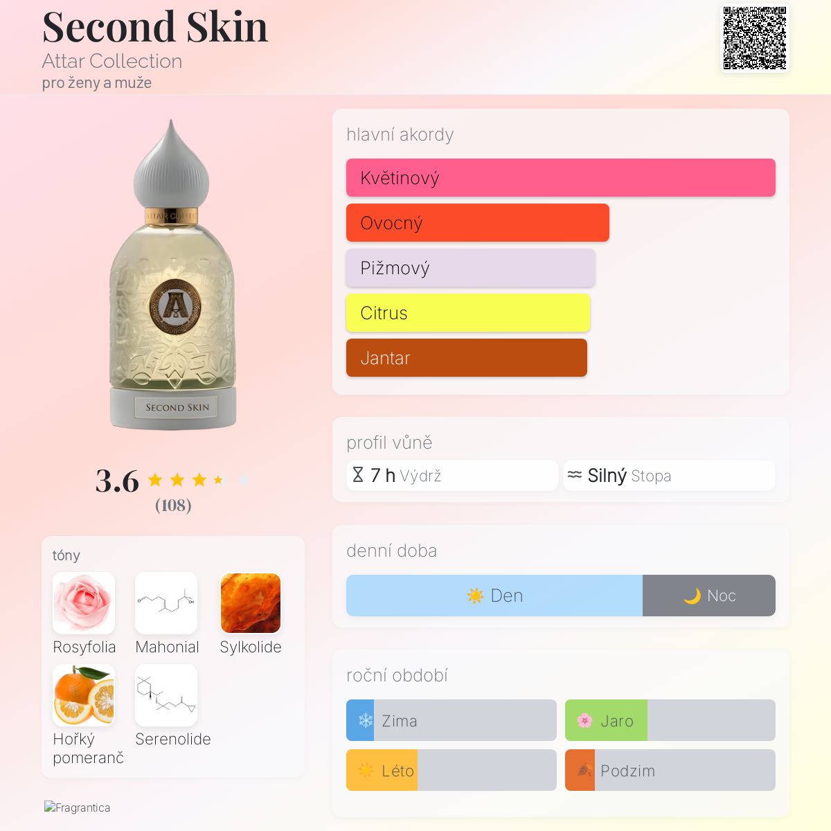 Second Skin podle Attar Collection je Floral Woody Musk vůně pro ženy a muže. Toto je nová vůně. Second Skin byl/a uveden/a v roce 2025. "Nosem" za touto vůní je Gaël Montero. Vrchní tón je Hořký pomeranč ; střední tóny jsouRosyfolia a Mahonial ; základní tóny jsou Sylkolide a Serenolide.
