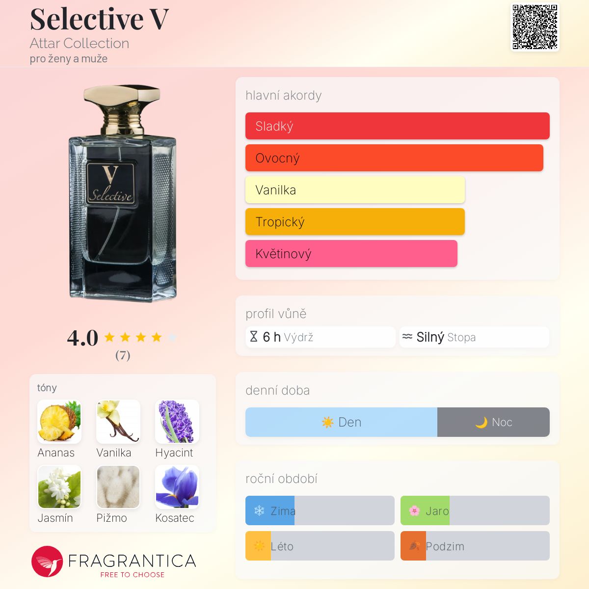 Selective V podle Attar Collection je Floral vůně pro ženy a muže. Selective V byl/a uveden/a v roce 2016. "Nosem" za touto vůní je Abdullah Mohsen Bin Shaya.