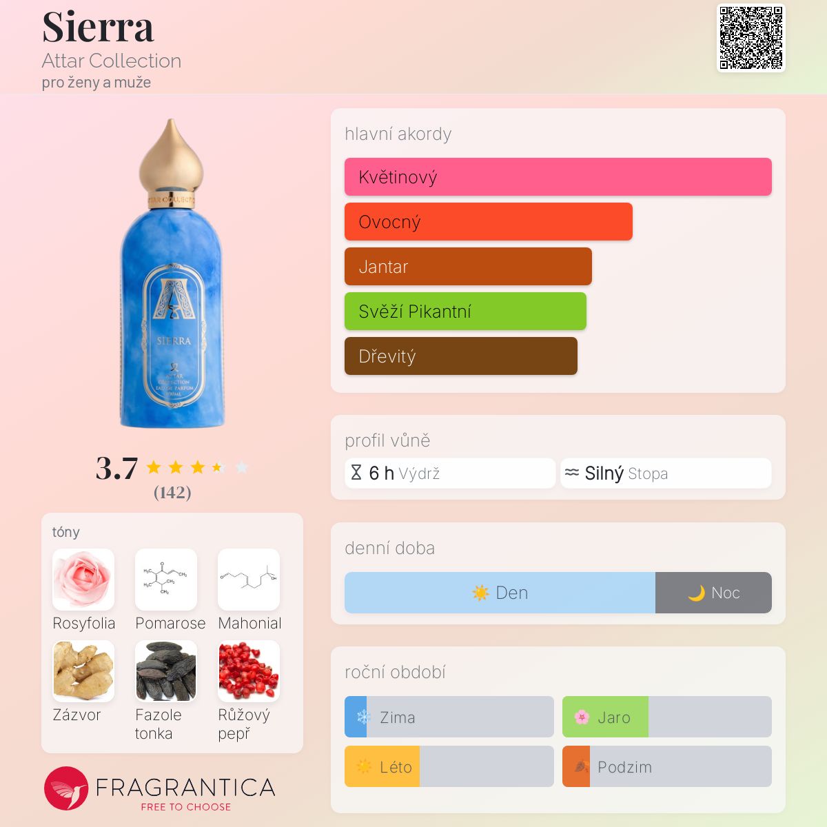 Sierra podle Attar Collection je Orientální Woody vůně pro ženy a muže. Toto je nová vůně. Sierra byl/a uveden/a v roce 2025. "Nosem" za touto vůní je Gaël Montero. Vrchní tóny jsou Zázvor a Růžový pepř; střední tóny jsouRosyfolia, Pomarose, Mahonial a Vonokvětka ; základní tóny jsou Fazole tonka, Cedr, Georgywood a Kadidlo.