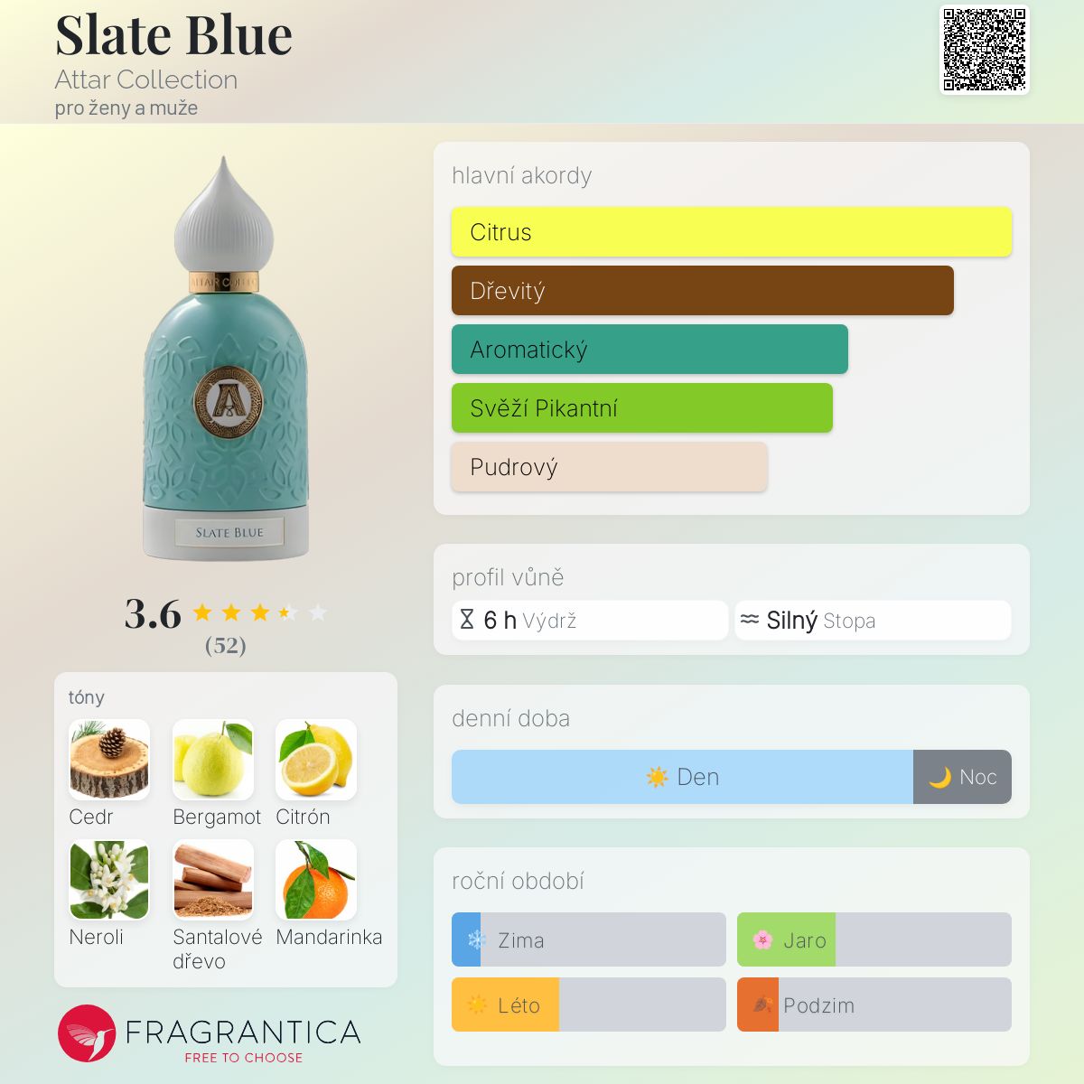 Slate Blue podle Attar Collection je Woody Aromatic vůně pro ženy a muže. Toto je nová vůně. Slate Blue byl/a uveden/a v roce 2025. "Nosem" za touto vůní je Gaël Montero. Vrchní tóny jsou Bergamot, Citrón, Mandarinka a Muškátový oříšek; střední tóny jsouNeroli, Pelargónie a Šalvěj ; základní tóny jsou Cedr, Santalové dřevo a Vetiver.