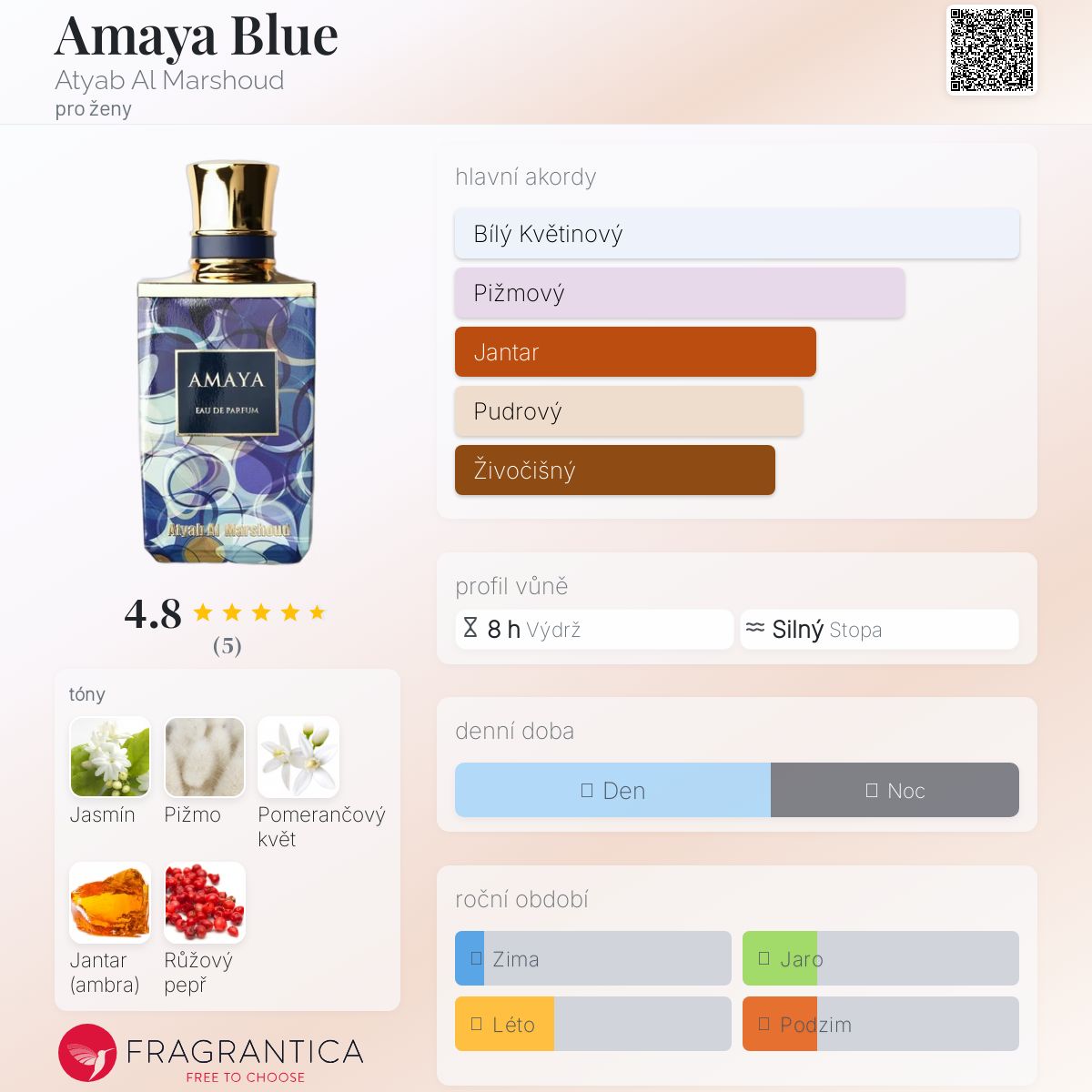 Amaya Blue podle Atyab Al Marshoud je Orientální Floral vůně pro ženy. Vrchní tón je Růžový pepř ; střední tóny jsouJasmín a Pomerančový květ ; základní tóny jsou Pižmo a Jantar (ambra).