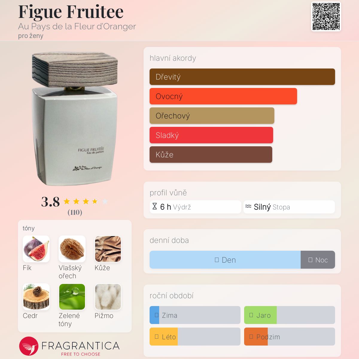 Figue Fruitee podle Au Pays de la Fleur d’Oranger je Floral Fruity vůně pro ženy. Figue Fruitee byl/a uveden/a v roce 2013. "Nosem" za touto vůní je Jean-Claude Gigodot. Vrchní tón je Fík ; střední tóny jsouVlašský ořech, Cedr a Zelené tóny ; základní tóny jsou Kůže a Pižmo.