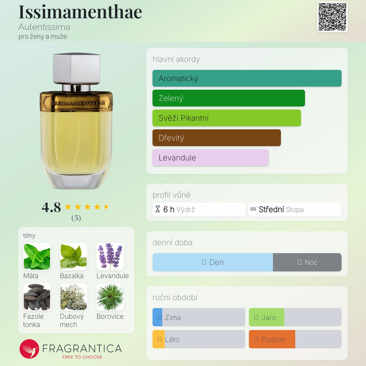 Issimamenthae podle Aulentissima je Woody Aromatic vůně pro ženy a muže. Issimamenthae byl/a uveden/a v roce 2017. "Nosem" za touto vůní je Giovanni Festa. Vrchní tóny jsou Vodní máta a Bazalka; střední tóny jsouLevandule a Fazole tonka ; základní tóny jsou Dubový mech a Borovice.