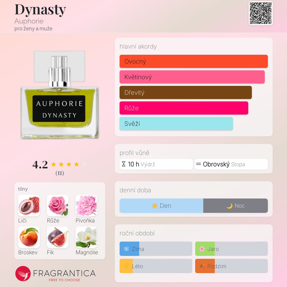 Dynasty podle Auphorie je Orientální Floral vůně pro ženy a muže. Dynasty byl/a uveden/a v roce 2015. "Nosem" za touto vůní je Eugene Au. Vrchní tóny jsou Liči, Broskev a Fík; střední tóny jsouRůže, Pivoňka a Magnólie ; základní tóny jsou Santalové dřevo, Cedr, Vanilka, Kadidlo a Pižmo.
