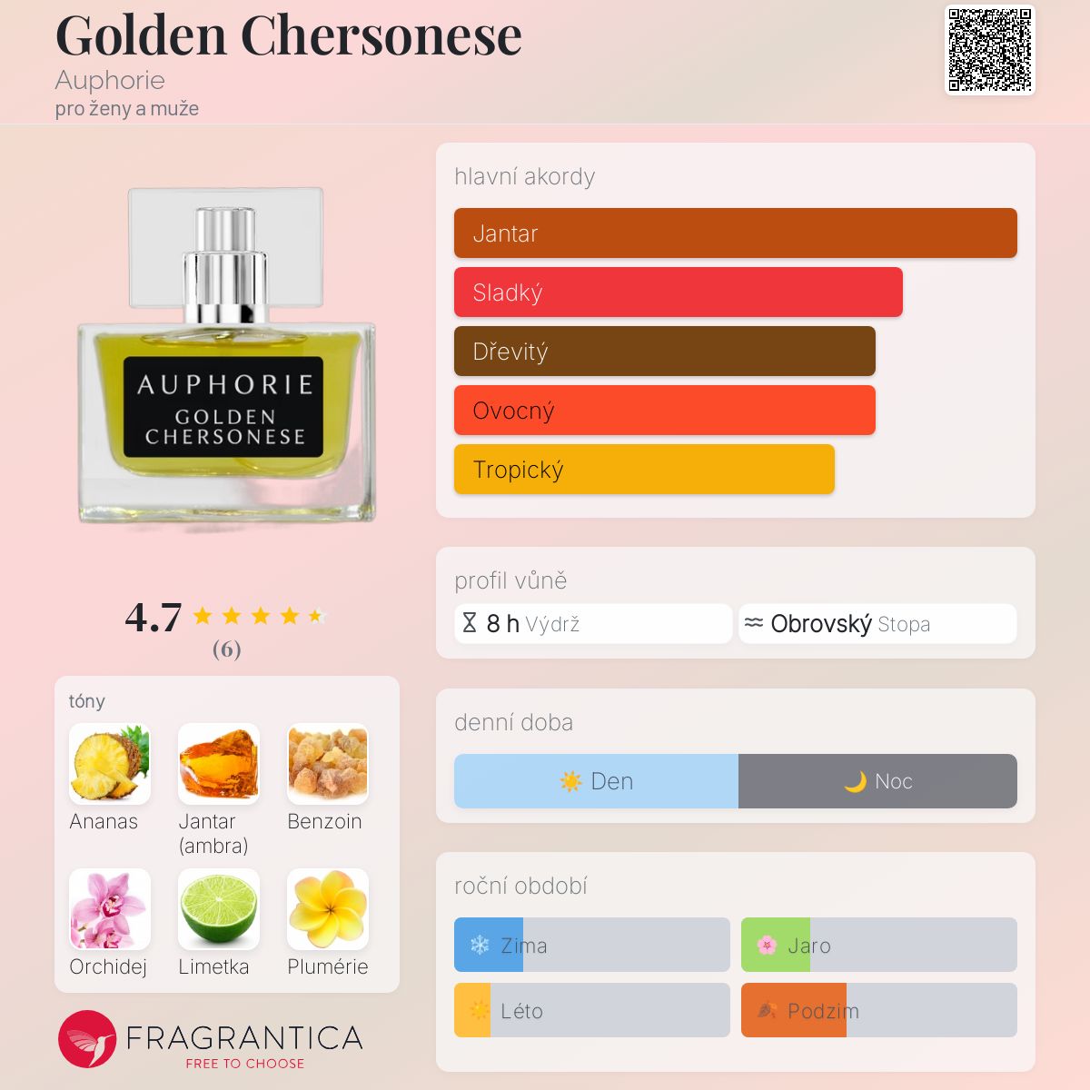 Golden Chersonese podle Auphorie je Orientální Floral vůně pro ženy a muže. Golden Chersonese byl/a uveden/a v roce 2015. "Nosem" za touto vůní je Eugene Au. Vrchní tóny jsou Ananas, Limetka a Mandarinka; střední tóny jsouDivoká orchidej a Plumérie ; základní tóny jsou Jantar (ambra), Benzoin, Týkové dřevo, Santalové dřevo, Cedr a Pižmo.
