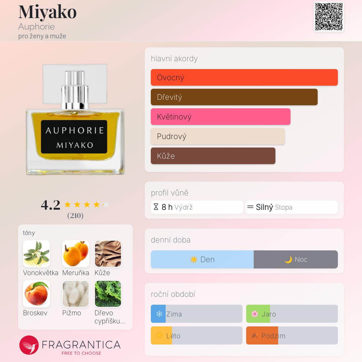 Miyako podle Auphorie je Floral Woody Musk vůně pro ženy a muže. Miyako byl/a uveden/a v roce 2015. "Nosem" za touto vůní je Eugene Au. Vrchní tóny jsou Meruňka, Broskev a Yuzu; střední tóny jsouVonokvětka, Kůže, Zelený čaj a Jasmín ; základní tóny jsou Pižmo, Dřevo cypřišku tupolistého, Santalové dřevo, List zmarličníku, Cedr a Pačuli.