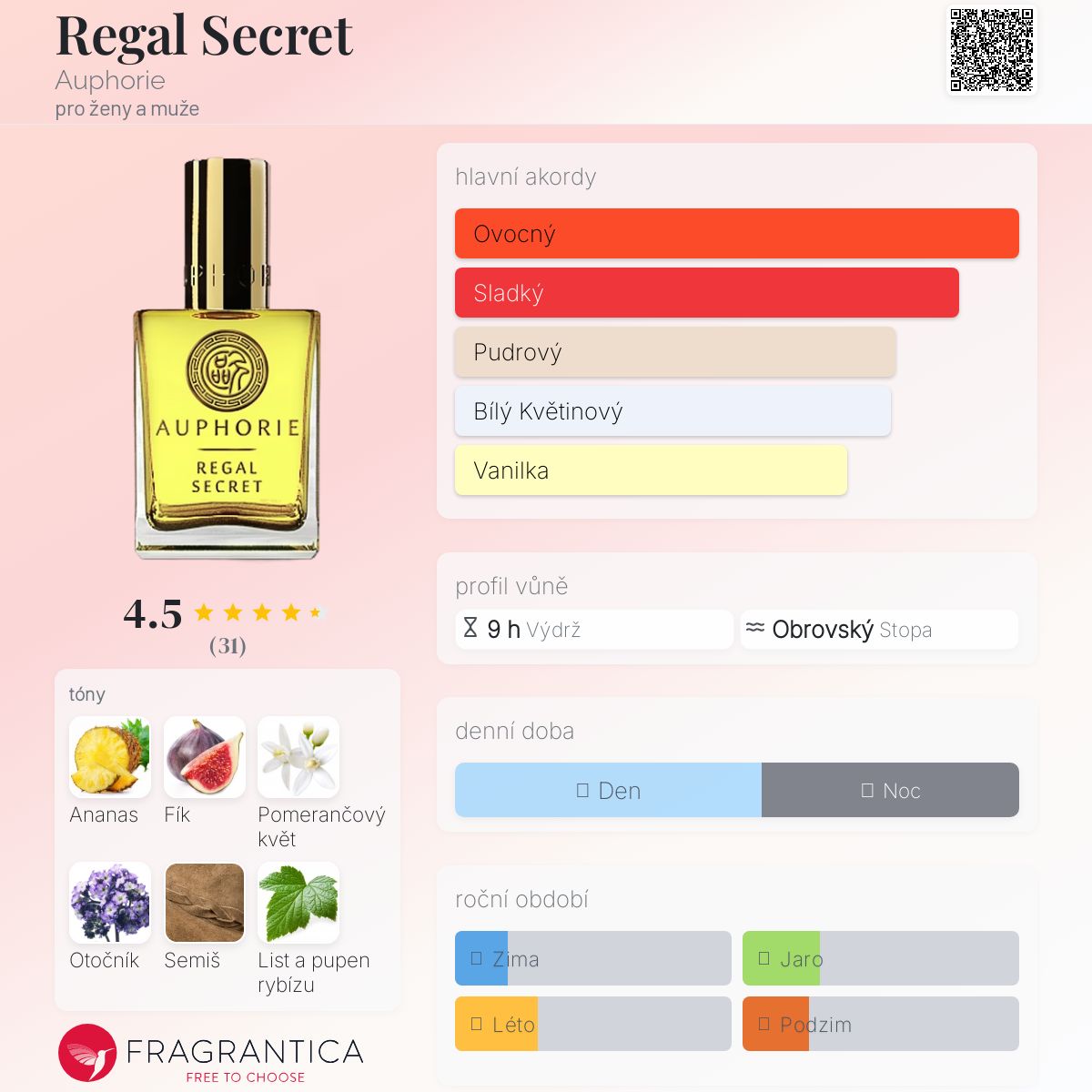 Regal Secret podle Auphorie je Orientální Floral vůně pro ženy a muže. Regal Secret byl/a uveden/a v roce 2016. Vrchní tóny jsou Ananas, Fík, Pomerančový květ, Černý rybíz a Bergamot; střední tóny jsouBílý semiš, Levandule, Jasmín a Růže ; základní tóny jsou Otočník, Pižmo, Dubový mech, Ambra a Vanilka.