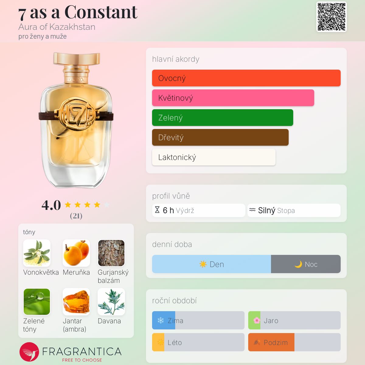 7 as a Constant podle Aura of Kazakhstan je Aromatic Fruity vůně pro ženy a muže. 7 as a Constant byl/a uveden/a v roce 2023. "Nosem" za touto vůní je Angéline Leporini. Vrchní tóny jsou Meruňka, Zelené listí, Davana, Vodnaté tóny a Mrkev; střední tóny jsouVonokvětka, Jantar (ambra) a Kořen orris ; základní tóny jsou Gurjanský balzám, Pižmo, Agarové dřevo (oud), Pačuli a Kašmírové dřevo.