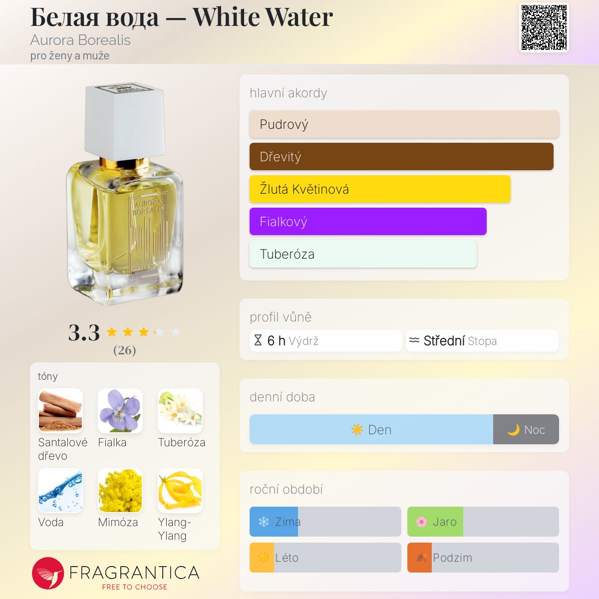 Белая вода — White Water podle Aurora Borealis je Floral Woody Musk vůně pro ženy a muže. Белая вода — White Water byl/a uveden/a v roce 2022. "Nosem" za touto vůní je Yana Andreeva. Vrchní tóny jsou Vodnaté tóny, Černý rybíz a Bergamot; střední tóny jsouTuberóza, Mimóza a Ylang-Ylang ; základní tóny jsou Santalové dřevo, Fialka a Fazole tonka.